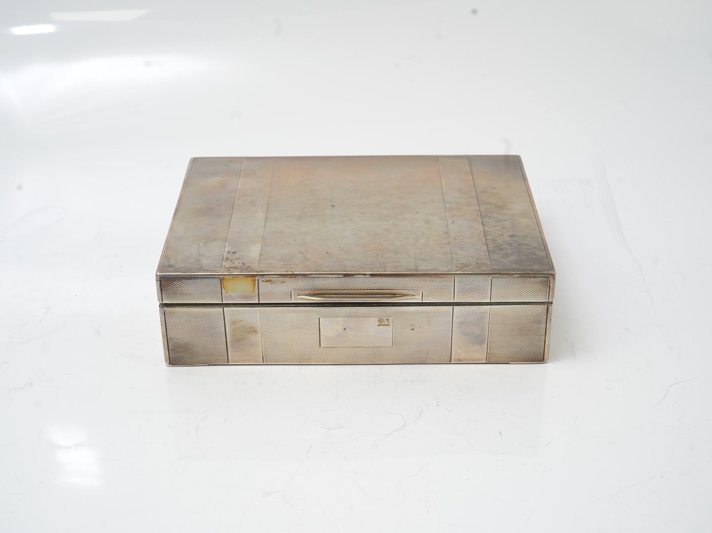A George V part engine turned silver mounted rectangular cigarette box by Sampson Mordan & Co, with two interior compartments, London, 1924, 16.7cm.