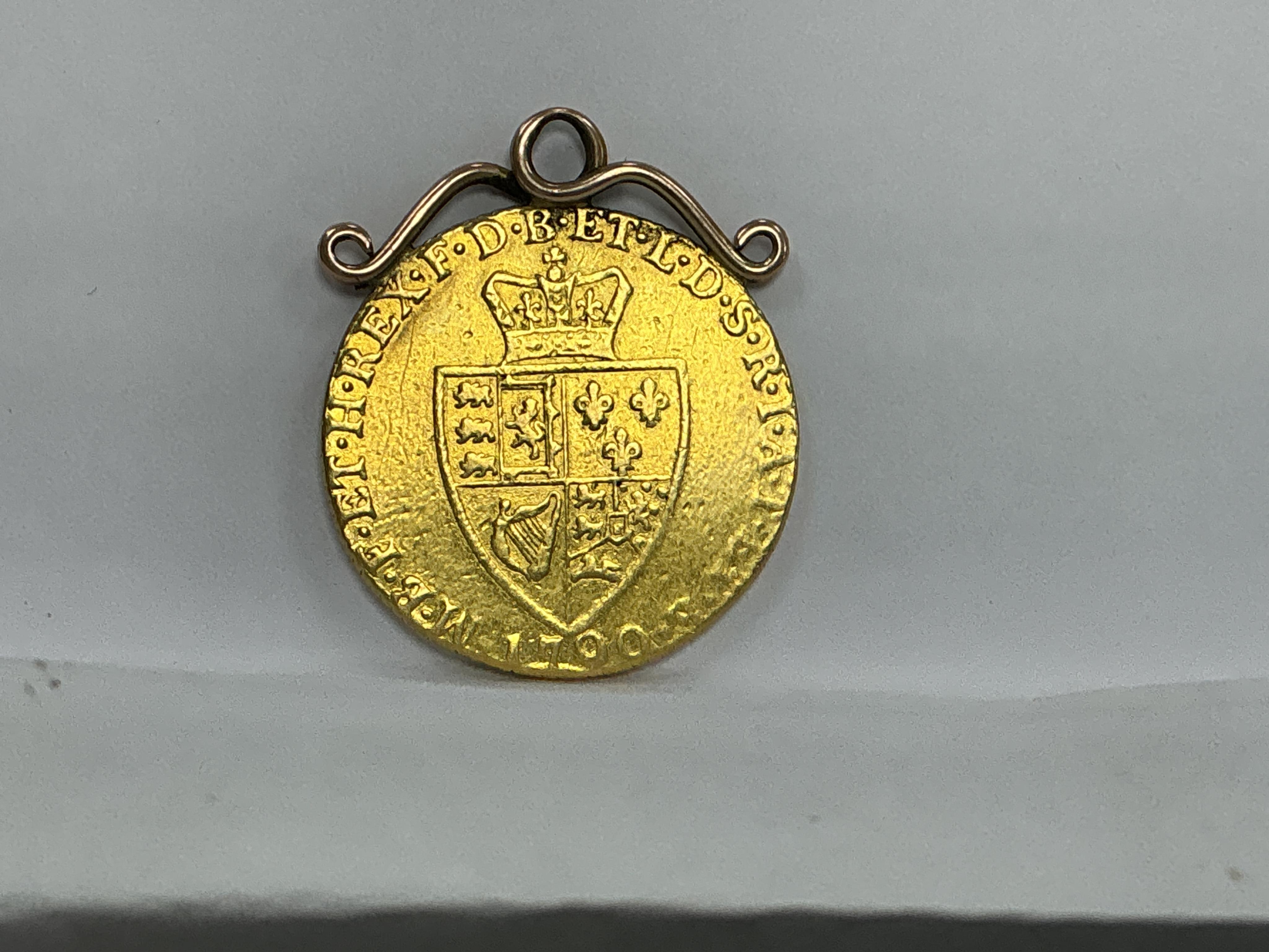 British gold coins, George III, spade guinea, 1790, mounted, about fine, gross weight approximately 8.78 g