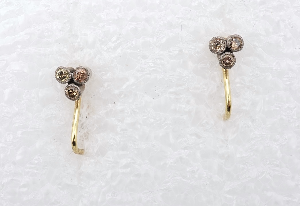 A pair of diamond earrings, each set with three circular-cut diamonds, totalling approximately 0.12 carats, mounted in gold, hook and clip fittings, length 1.3cm, indistinct assay marks, combined gross weight approximately 1.4 grams