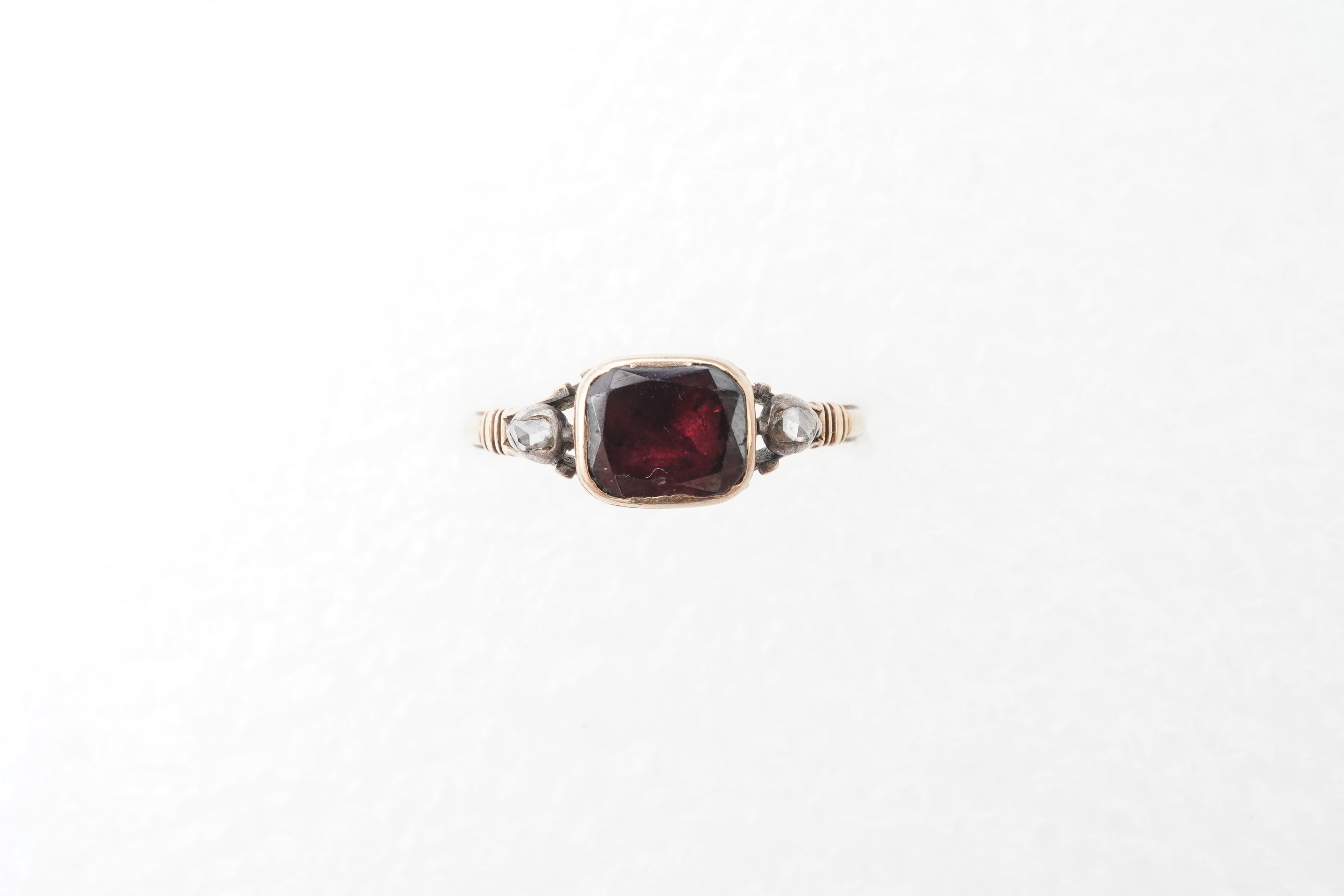A Georgian garnet and diamond ring, 18th century, set with a foiled table-cut garnet in a closed setting with fluted decoration to the reverse, to shoulders set with rose-cut diamonds, mounted in silver and gold, size S1/2, gross weight approximately 2 grams