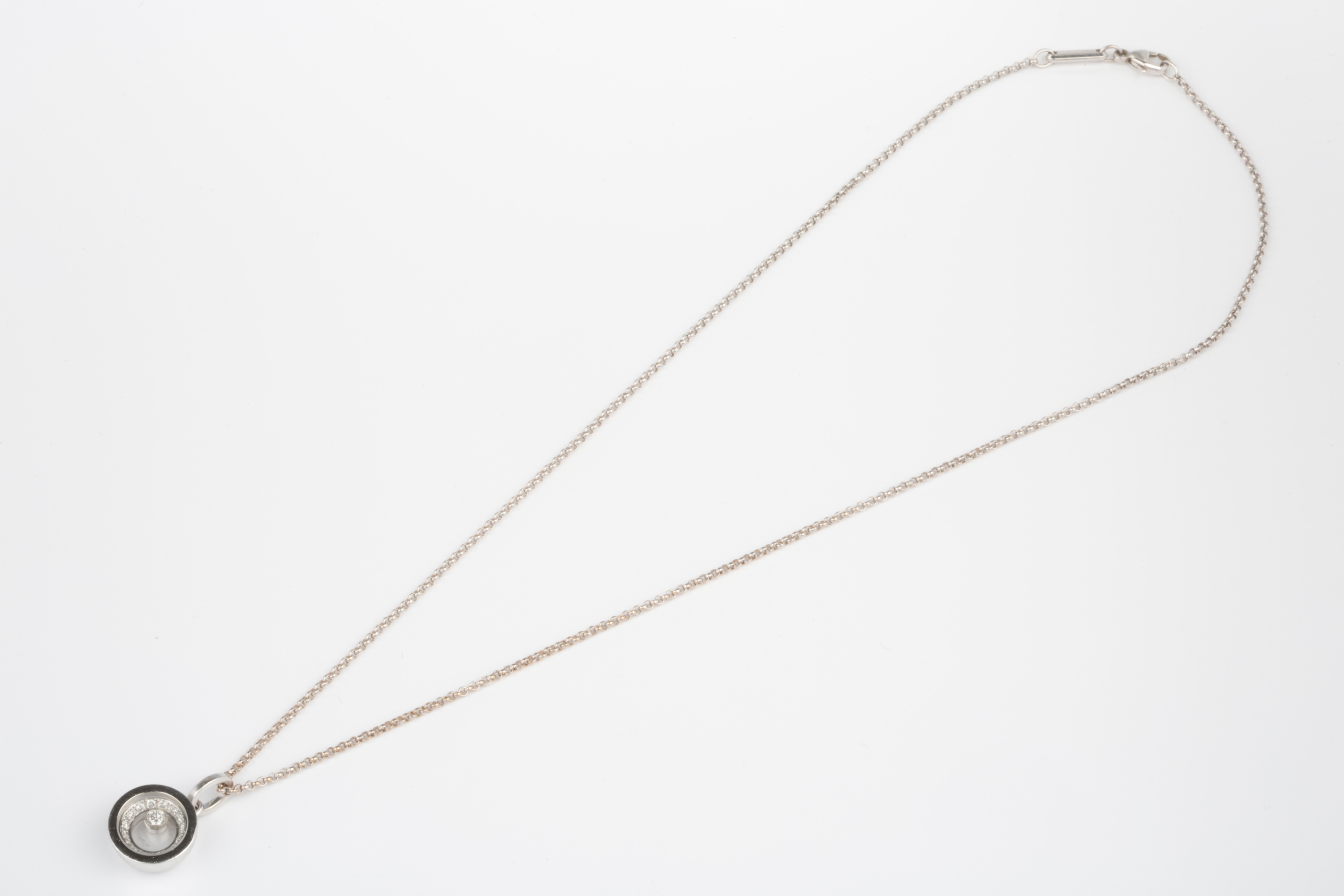 Chopard, a 'Happy Diamonds' pendant, the circular pendant designed as a glazed compartment, containing a freely moving collet-set brilliant-cut diamond weighing approximately 0.10 carats, the interior lined with pavé-set brilliant-cut diamonds, to a chain necklace, pendant length 2cm, signed Chopard, stamped 750, numbered 797789-1001 and 6225239, chain signed Chopard, stamped 750, gross weight approximately 11 grams
