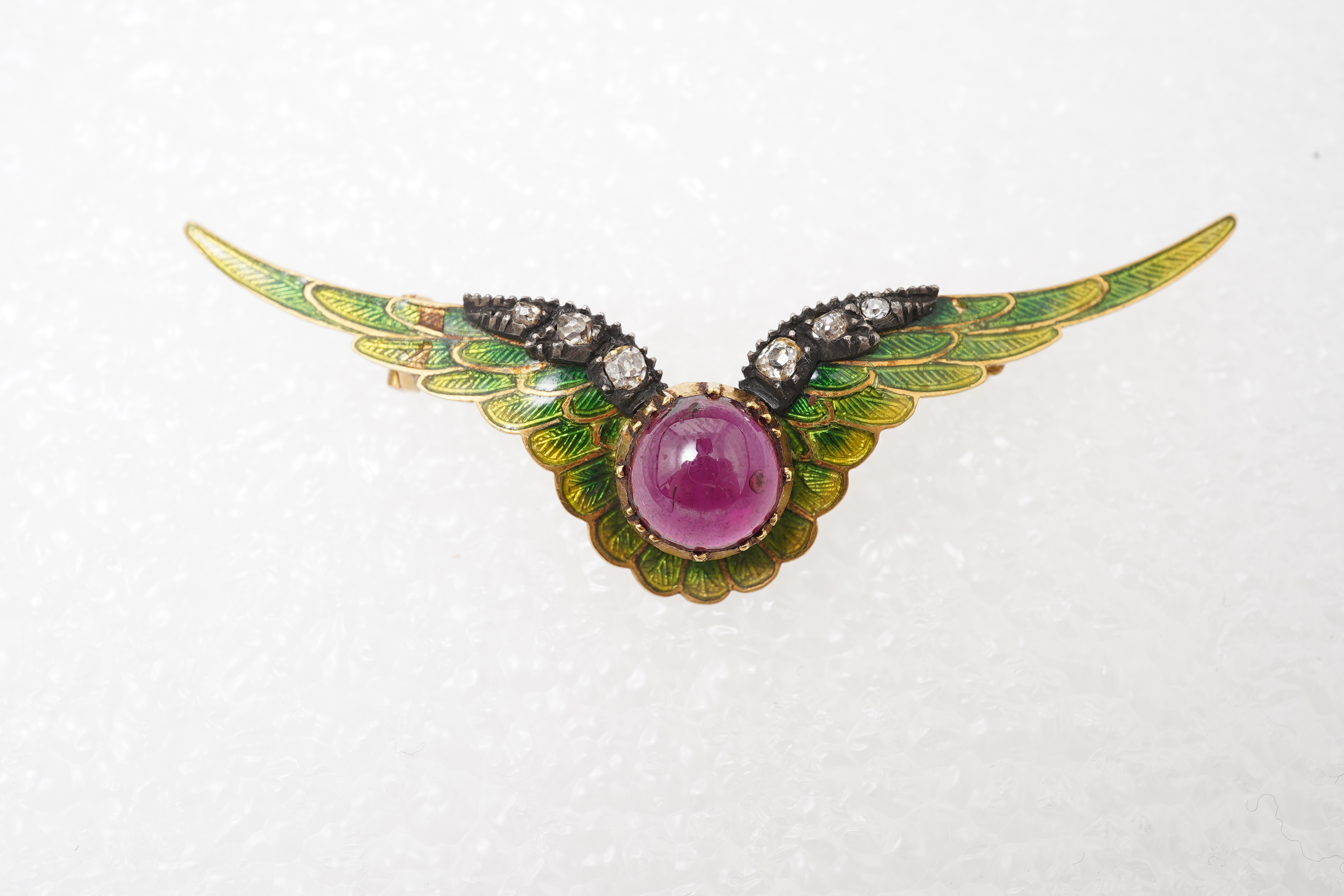 Carlo and Arthur Giuliano, a Victorian enamel, garnet and diamond brooch, late 19th century, designed as a pair of outstretched wings in green basse taille enamel, accented with cushion-shaped diamonds, centring on a cabochon garnet, mounted in silver and gold, length 6.2cm, signed C&AG, gross weight approximately 6 grams, original fitted tooled leather case stamped C&A Giuliano, 115 Piccadilly London