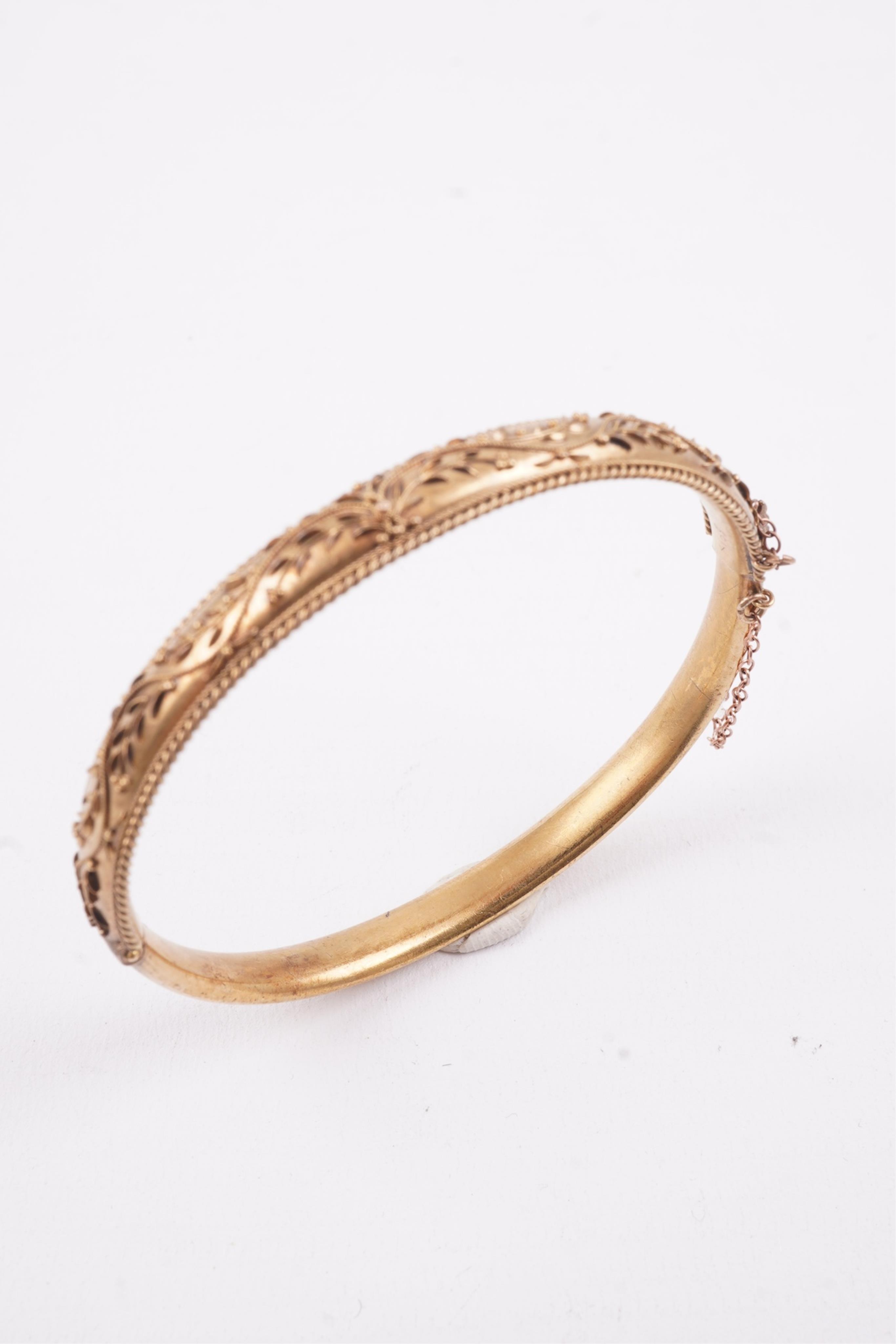 A Victorian gold bangle, late 19th century, of hinged construction, the front applied with foliate wirework in a rope twist border, mounted in gold, inner circumference 16.2cm, stamped 15T, gross weight approximately 9.5 grams