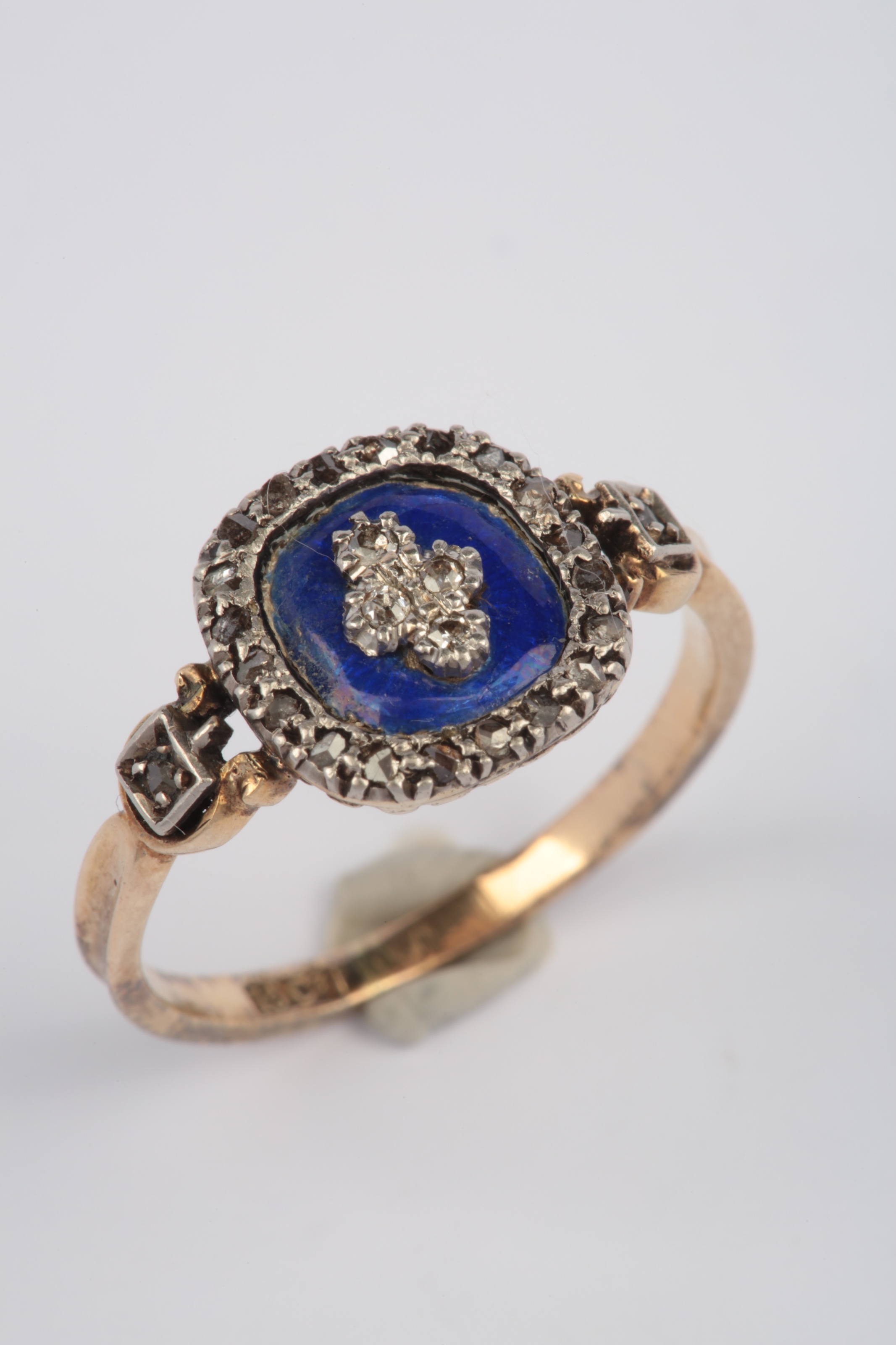 An enamel and diamond ring, early 20th century, of 18th century inspiration, designed as a panel of blue enamel centring on a cluster of circular-cut diamonds, within a border and shoulders of rose-cut diamonds, the reverse of fluted design, mounted in silver and gold, size L, stamped 15CT, gross weight approximately 3 grams