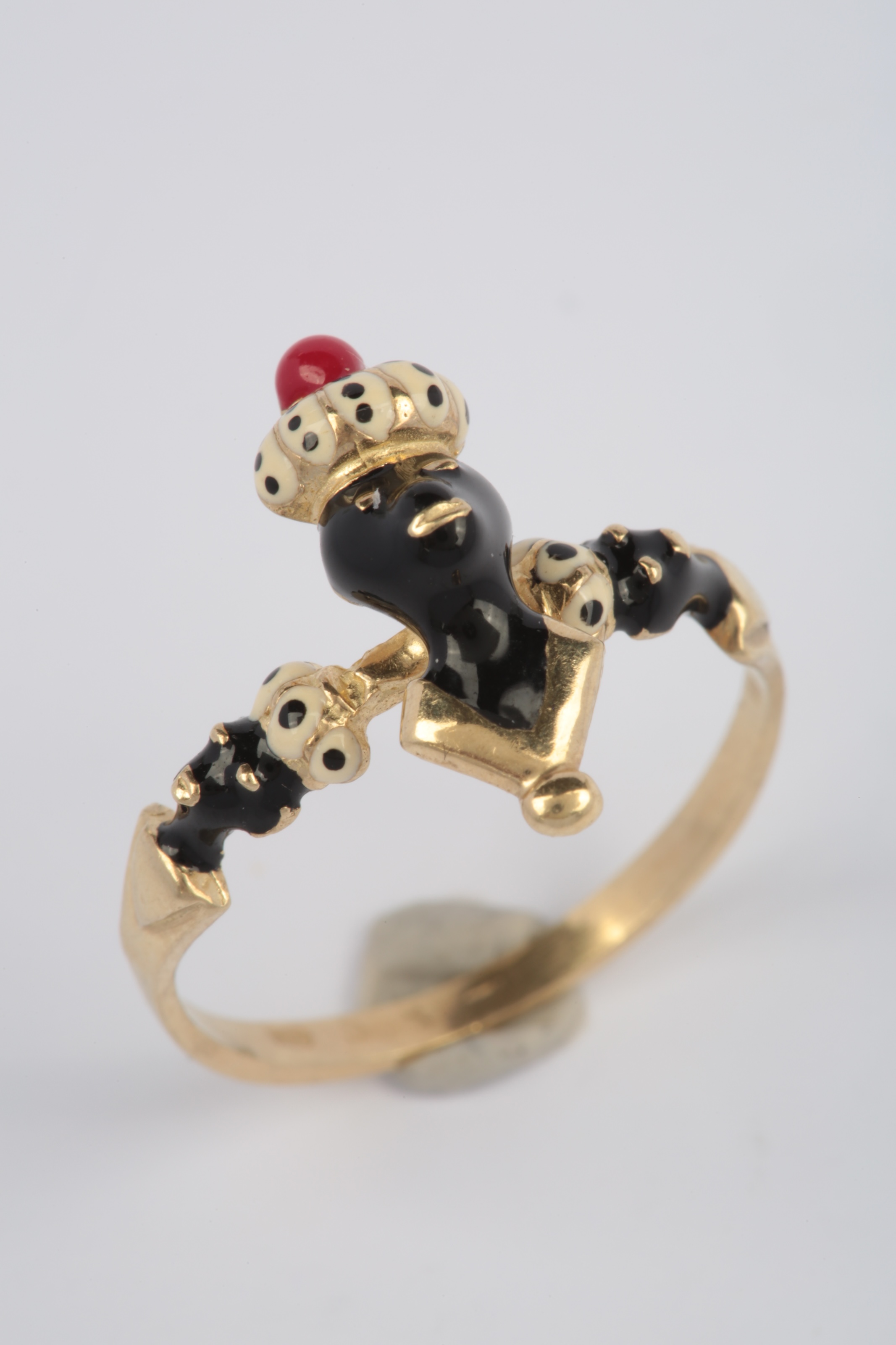 An enamel ring, applied with black, white and red enamel, to depict the bust of a figure dressed as a 'Blackamoor', the shoulders of similar design, mounted in gold, size O, stamped 585, assay marks, gross weight approximately 2.5 grams