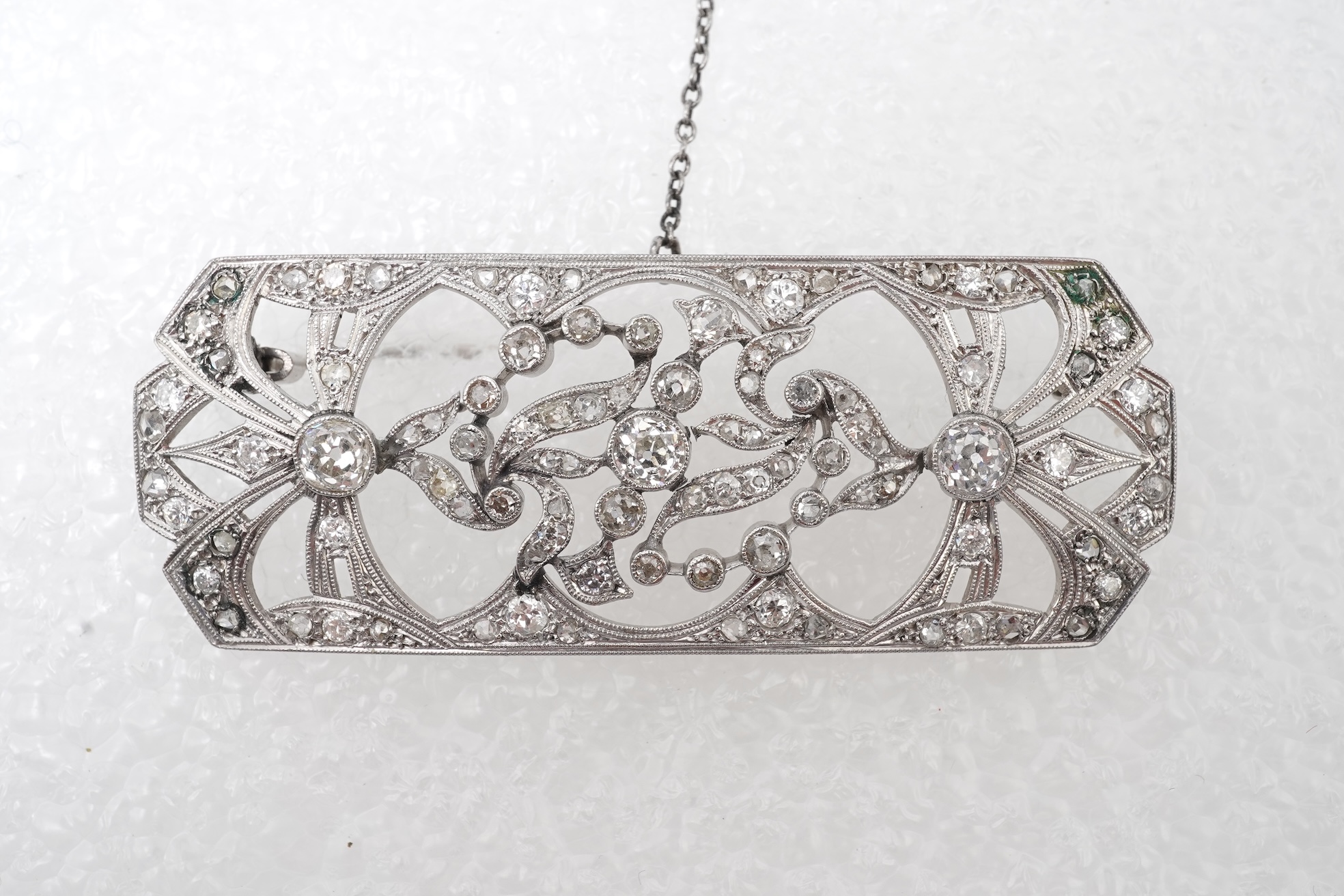 Lot 1110 , An Art Deco diamond brooch, 1920s, designed as a plaque of foliate openwork, set with circular-cut and cushion-shaped diamonds totalling approximately 1.90 carats, mounted in millegrain-bordered platinum, length 5.9cm, g