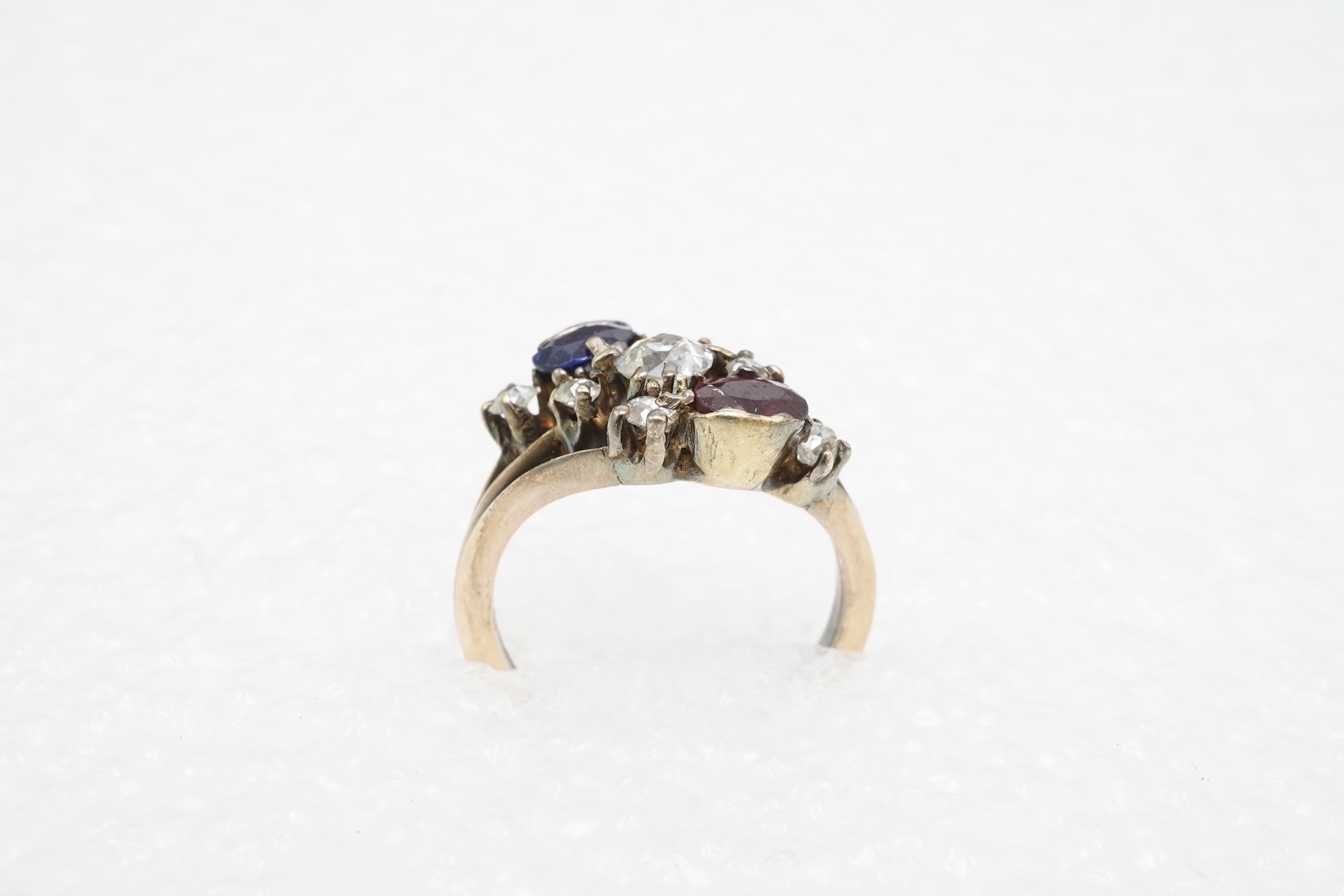 Lot 456 , A sapphire, ruby and diamond ring, circa 1900