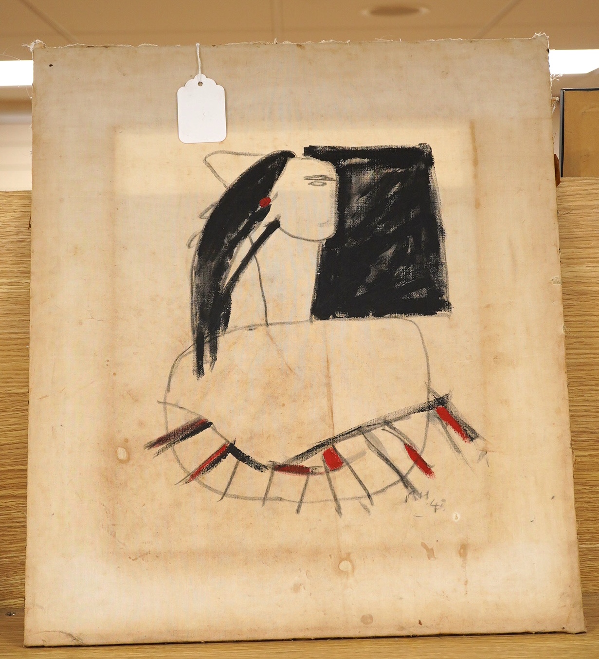 Manner of Roger Hilton (1911-1975) abstract composition, figural study, bearing initials and date ‘42, oil on linen canvas, unframed, 46 x 40cm