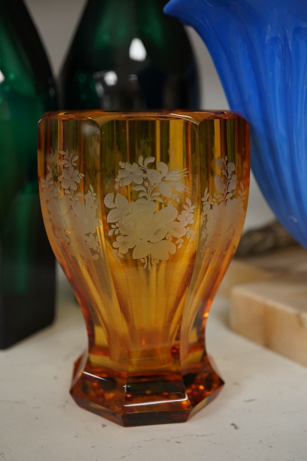 A pair of 19th century green glass bottles, two glass cornucopia and an amber glass, tallest 29cm