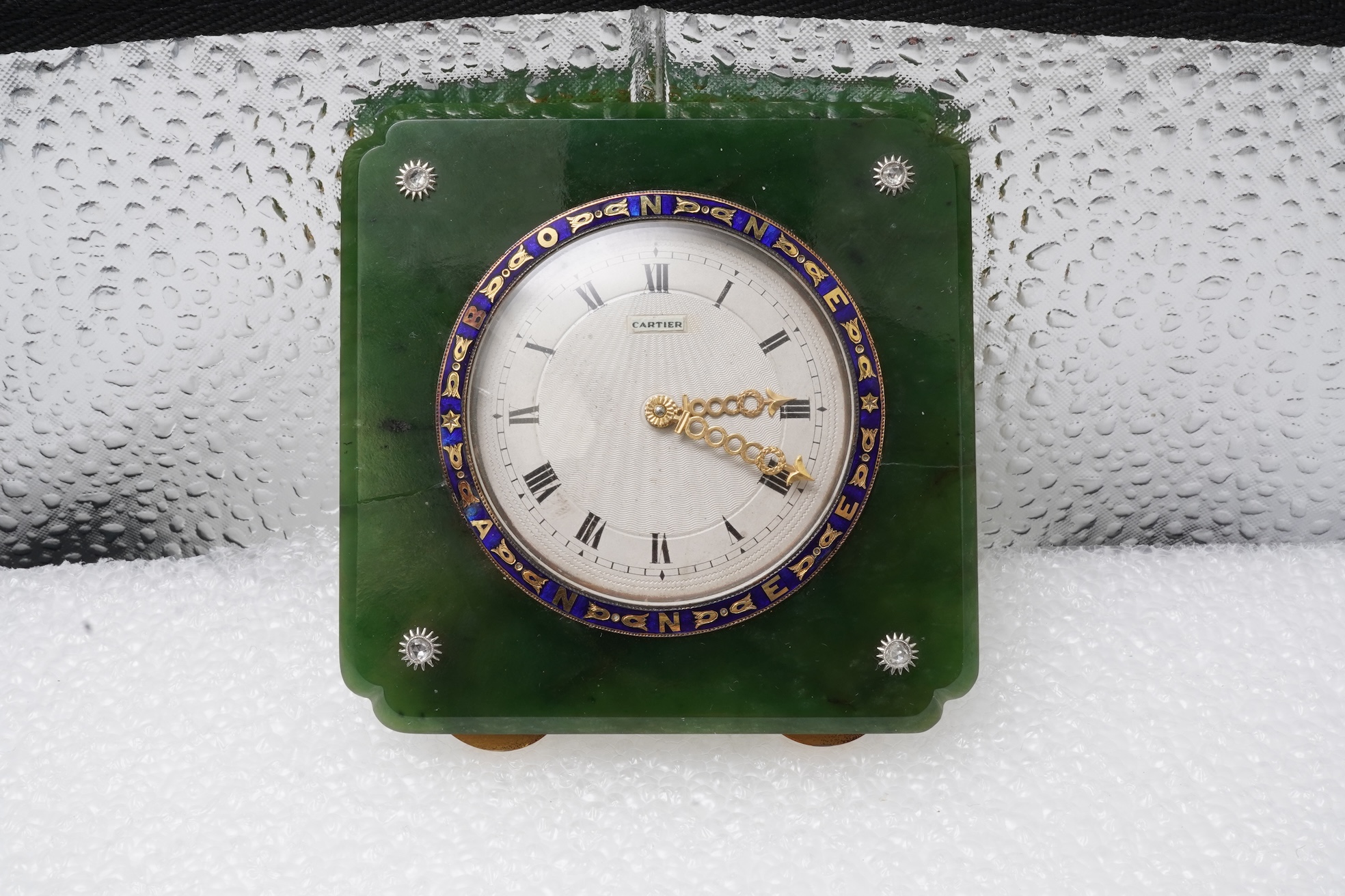 An Art Deco nephrite, enamel and diamond desk timepiece, circa 1920, the silvered dial with engine turned decoration, with black Roman numeral indicators and gold openwork hands of laurel wreath design, within a border applied with deep blue enamel, the words 'BONNE ANNEE' ('Happy New Year') in reserve, within a mount of square outline with bevelled 'Japanese' corners in polished nephrite, accented to each corner with a rose-cut diamond in a star-shaped mount, the reverse with a hinged gilt metal strut, dial approximately measuring approximately 4.5cm, overall approximately 7.5 x 7.5 x 2.8cm including base back and winder, dial with applied plaque inscribed Cartier, strut numbered 519 and 4362, movement unsigned, numbered 154474, and 474, restoration