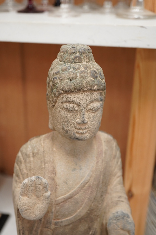 A Chinese composition stone standing figure of Buddha, 48cm high