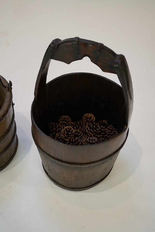 Lot 2 , A Chinese staved wood bucket and a coopered oak bucket with wrought iron swing handle, largest 61cm high