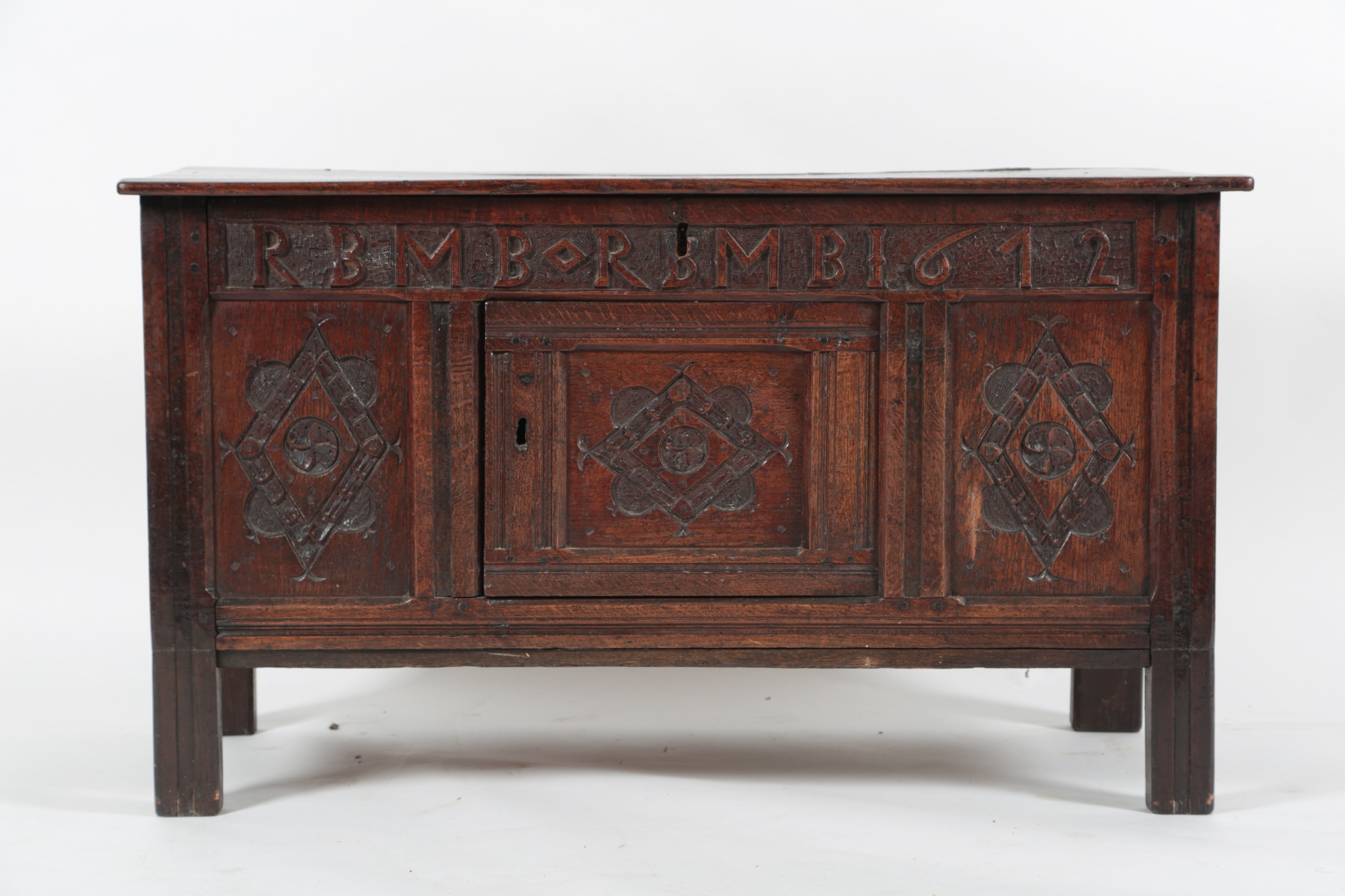 A Charles II oak coffer, dated 1672, the plank top above a frieze carved in relief RBMB . RBMB 1672, above three panels carved with lozenges, the central panel once hinged, now fixed, on replacement stile feet to the front, 117.5cm wide, 50cm deep, 68cm high
