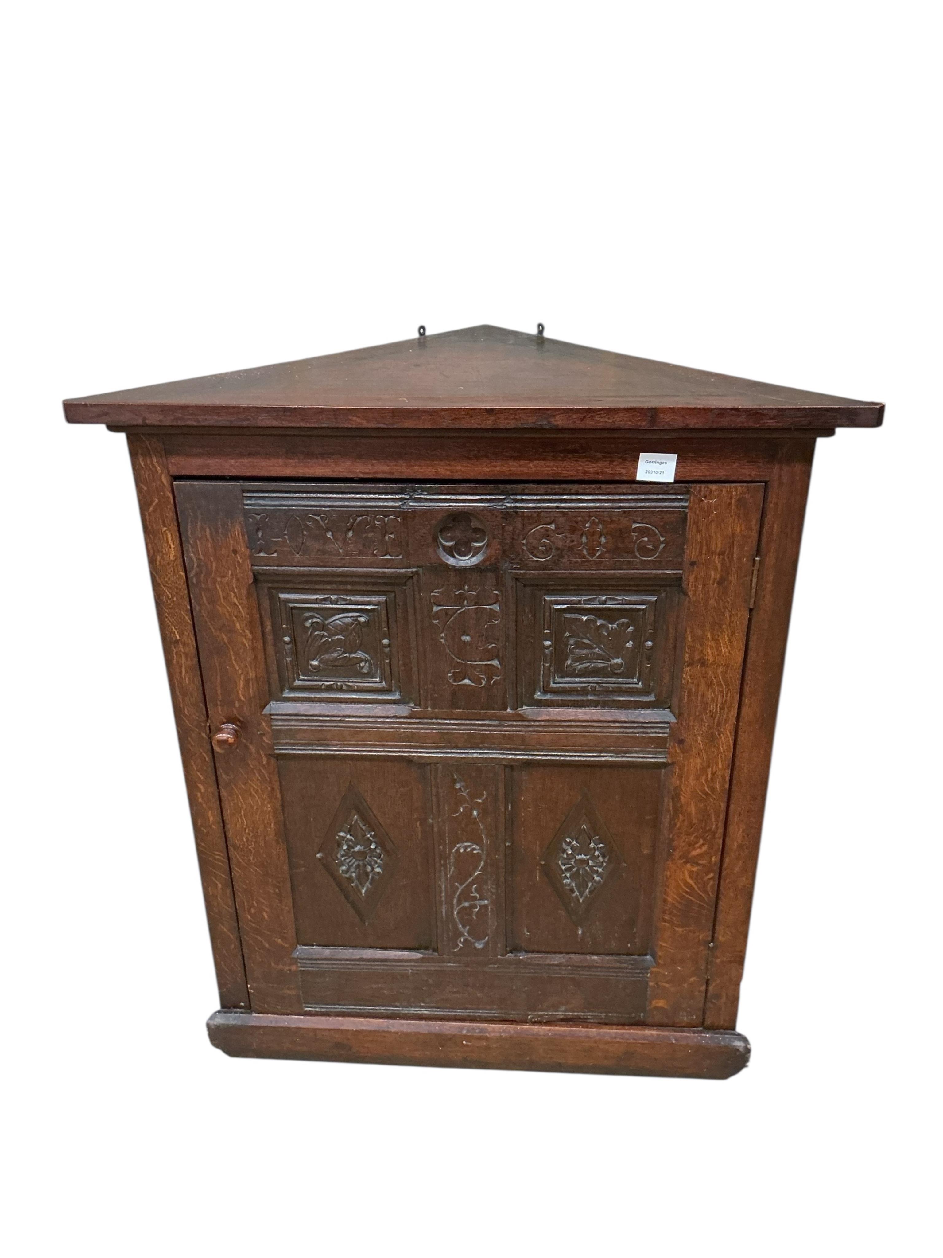Lot 6 , A 19th century carved oak corner cupboard, width 86cm, depth 43cm, height 100cm