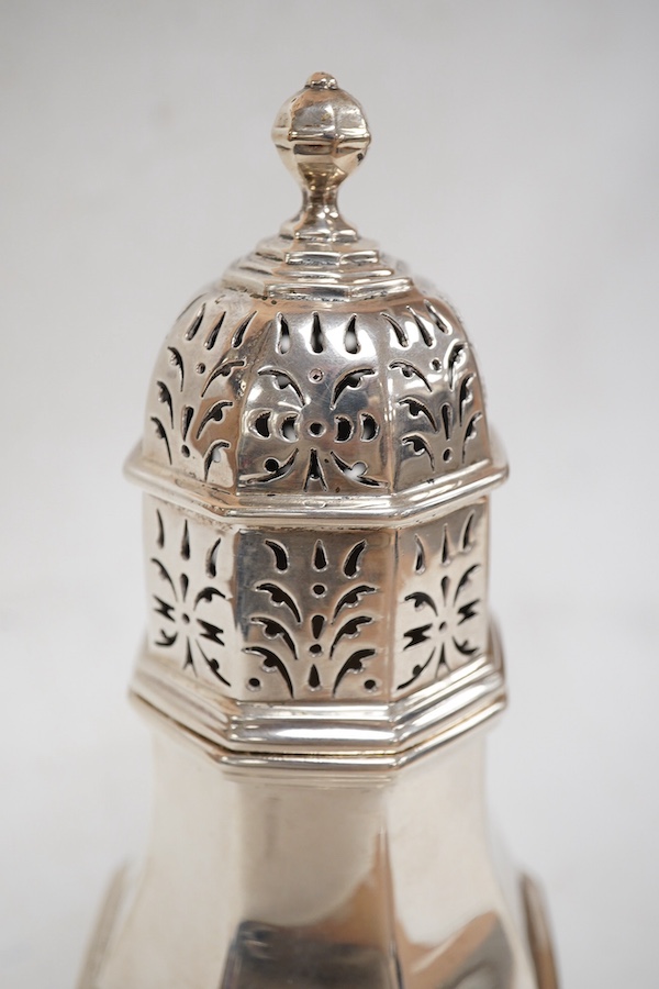 A George V silver octagonal baluster shaped sugar caster, Thomas Bradbury & Sons, Sheffield, 1927, 19.6cm, 11oz.