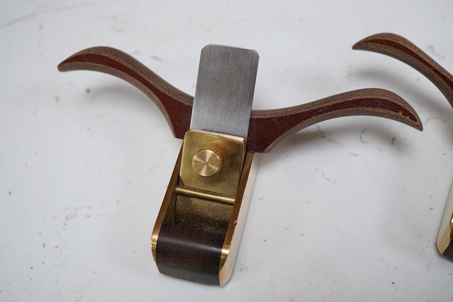 Lot 1037 , A set of three 'winged' brass thumb planes with wood infills and flat soles, widest iron 19mm