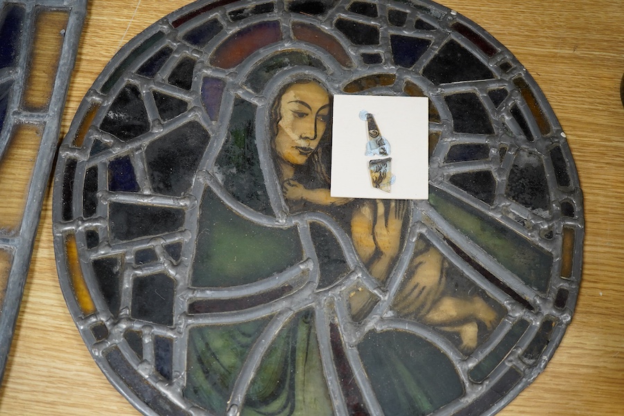 Max Parsons (1915-1998), Leaded stained glass panels, roundel of the virgin child and a full length study of a saint, largest 72cm high