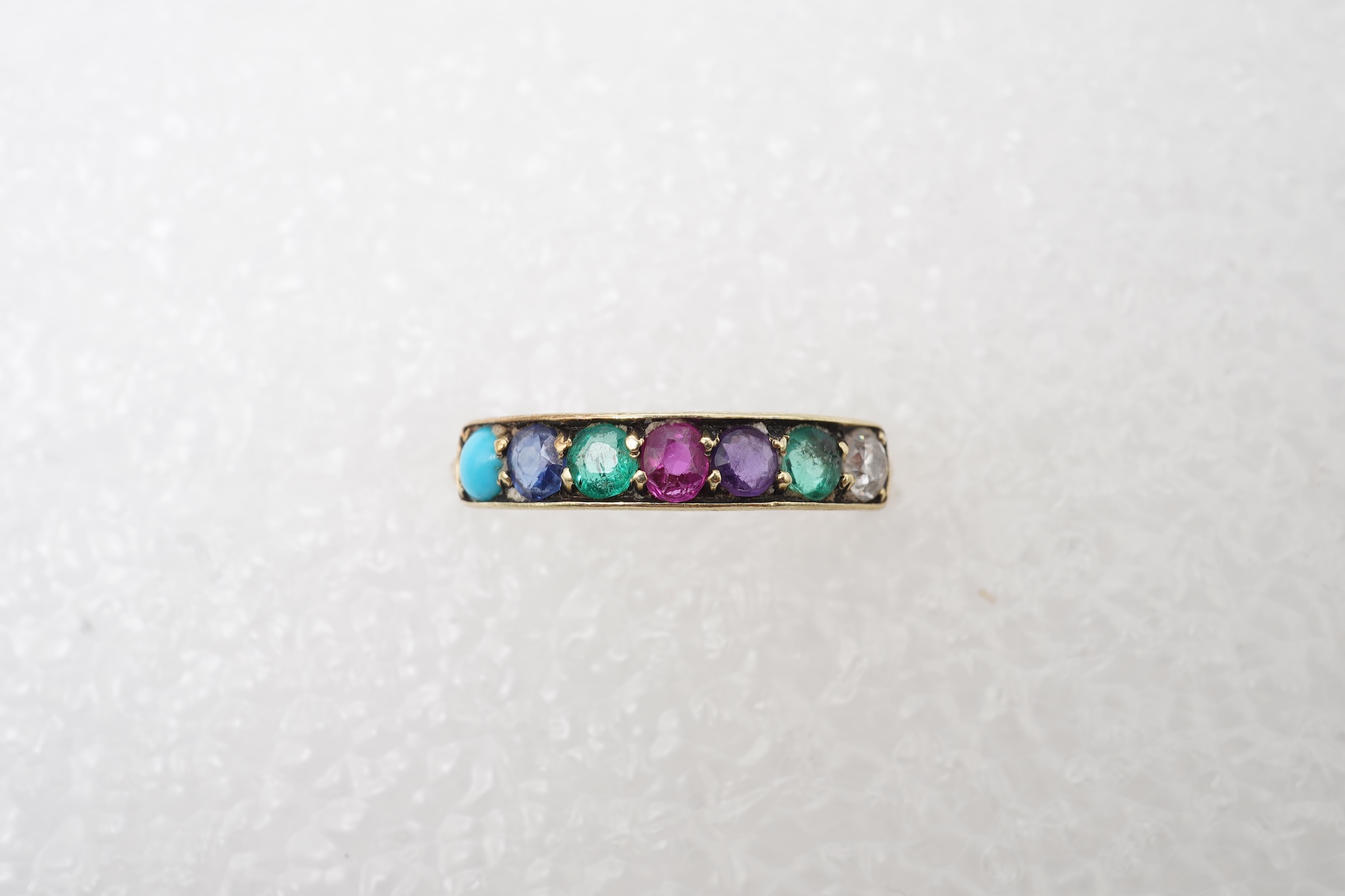 A multi-gem acrostic ring, mid 20th century, set with a sequence of diamond, emerald, amethyst, ruby, emerald, sapphire and turquoise, their initials spelling 'DEAREST', mounted in gold, size M, gross weight approximately 1.5 grams