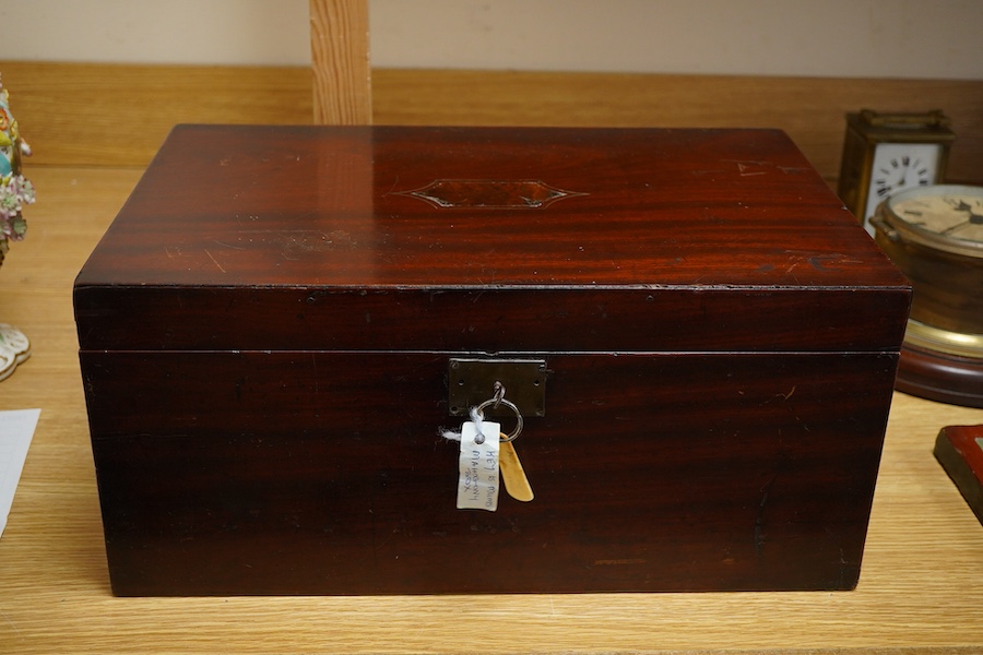Lot 416 , An early 19th century mahogany correspondence box with secret compartment, campaign style flush handle concealing button release, with key, 45cm wide
