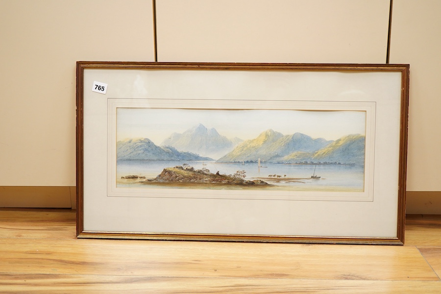 Attributed to Edwin Earp (1851-1945), Mountainous riverscape with boats and cattle, unsigned, watercolour, 17 x 53cm