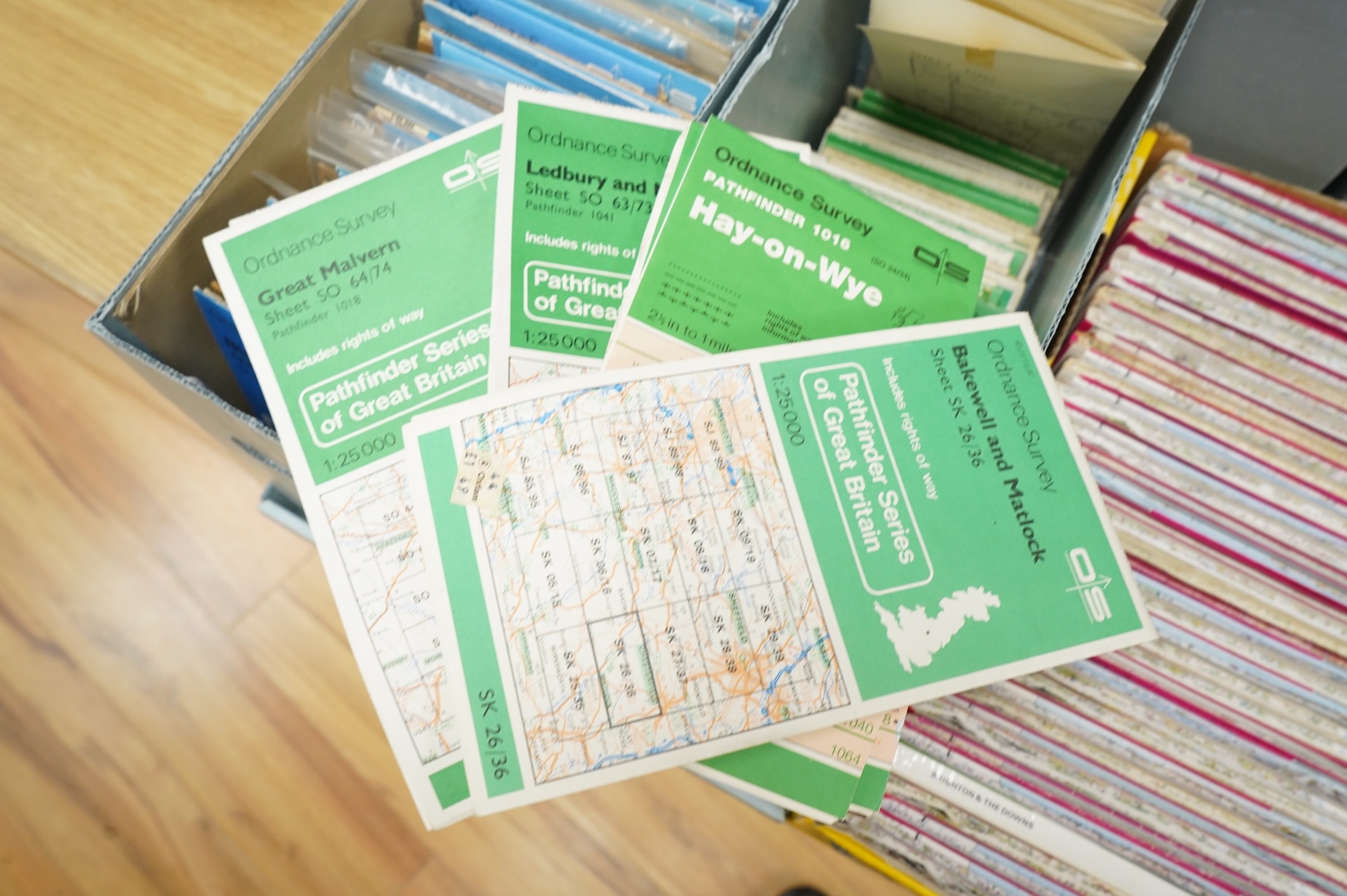A collection of Ordnance Survey maps, including; Pathfinder 1:25,000 second series, 1:25,000 first series, and Landranger series 1:50,000, etc. (3 boxes)