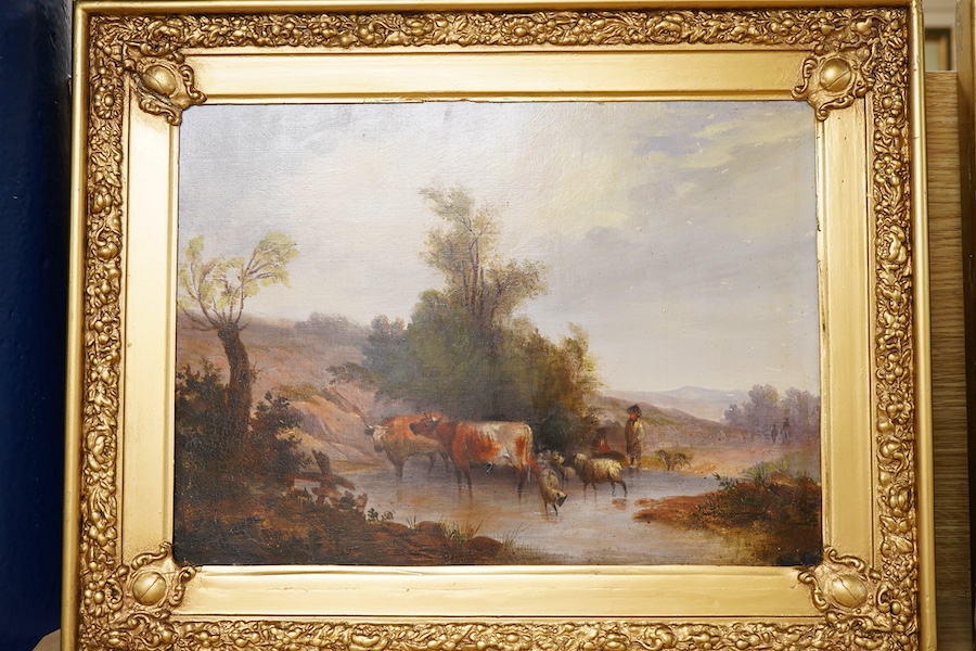 Early 20th century, English School, Riverscapes with cattle watering, one indistinctly signed, pair of oils on canvas board, 27 x 37cm, ornate gilt frames