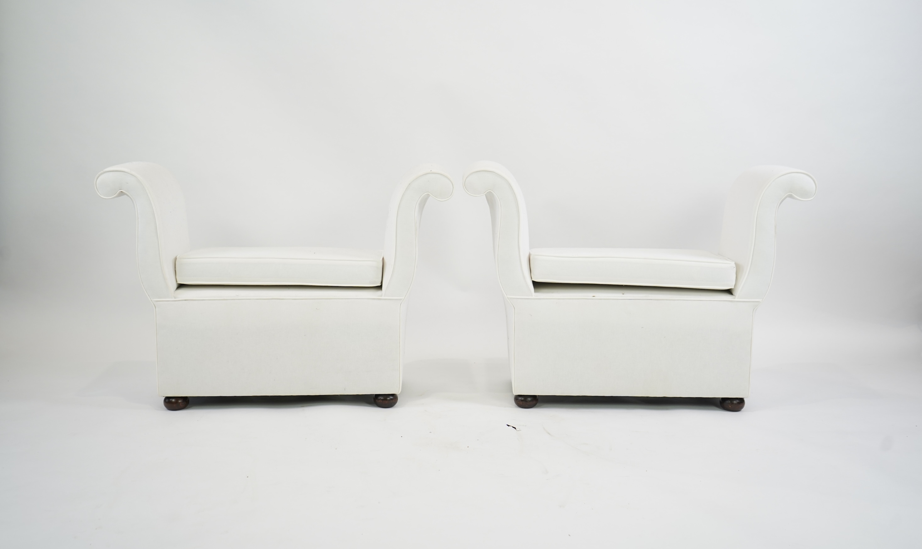Lot 160 , A pair Victorian style upholstered scroll end stools, with cushion seats on oak flat bun feet, 102cm wide, 34cm deep, 73cm high