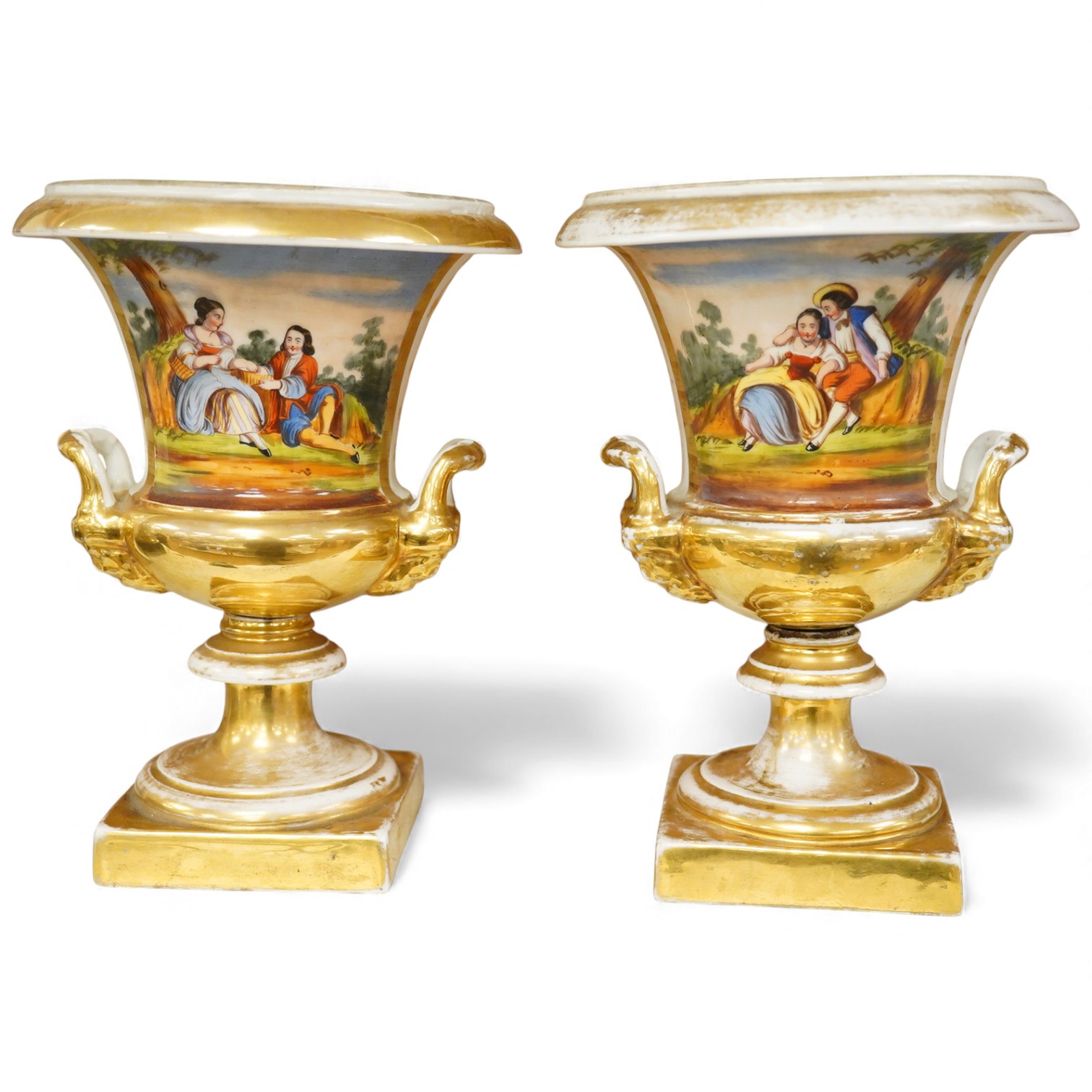 A pair of 19th century Paris porcelain campana urns, 22.5cm high