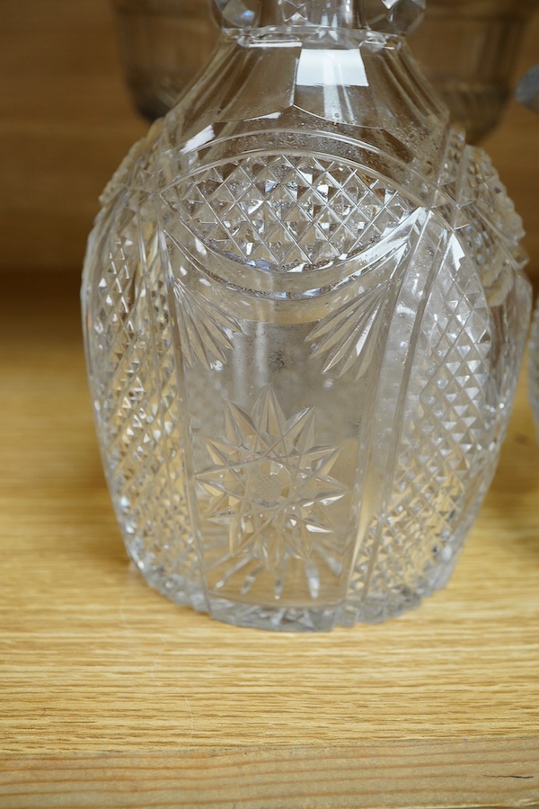 A collection of glassware to include a Waterford pedestal bowl, Georgian jug and a Victorian decanter, largest 28cm high