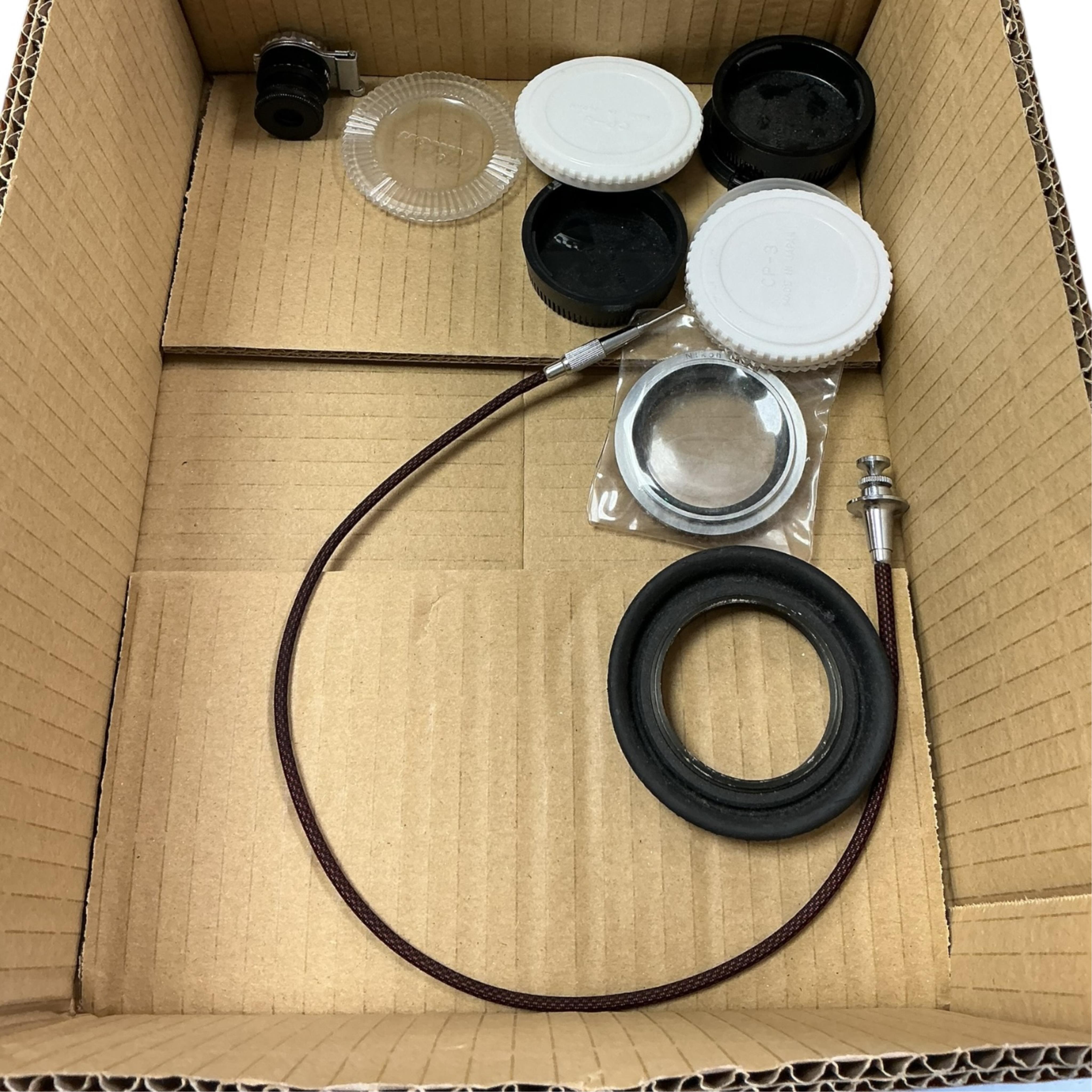 A Nikomat EL film camera with Nikon 50mm 1:14 lens, and accessories
