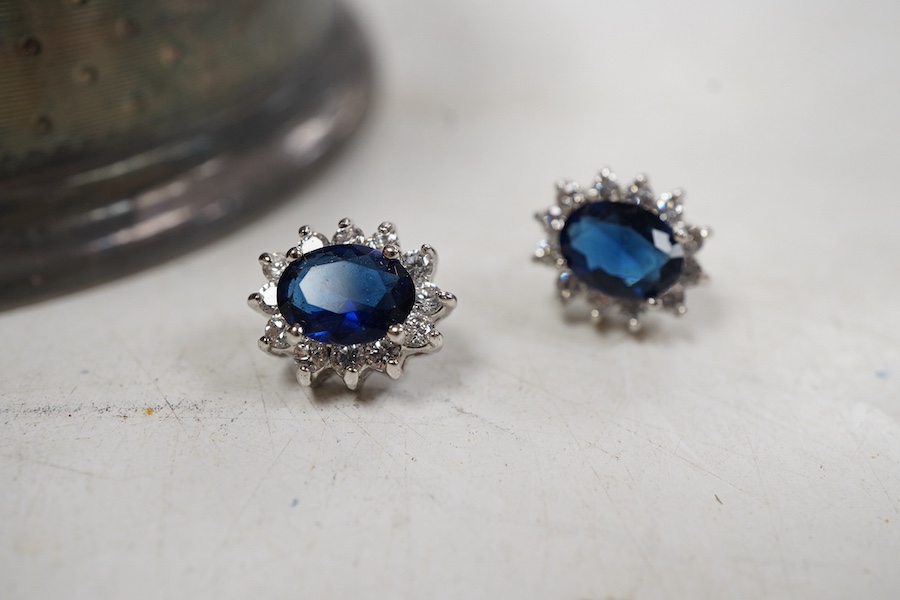 A George V part engine turned silver trinket box, with no cover, London, 1910, diameter 9cm, together with a pair of 925 drop earrings and a pair of paste ear studs.