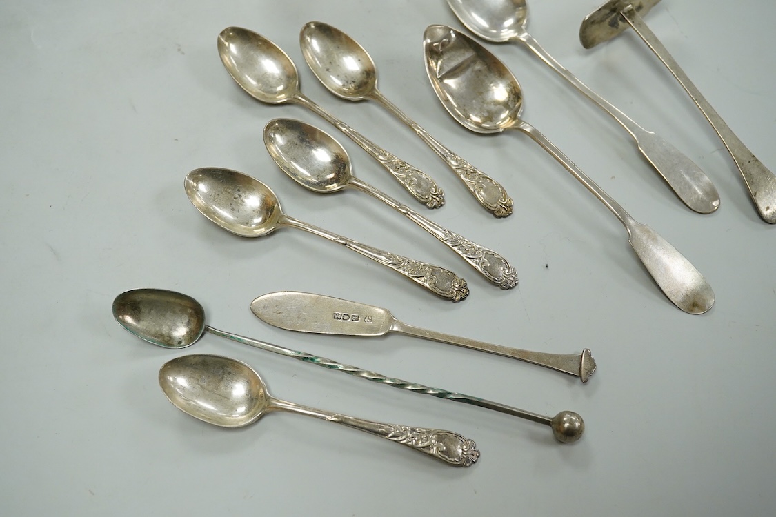 A continental white metal beaker, 69mm, five late Victorian silver coffee spoons, a silver pusher and butter knife and three white metal items.