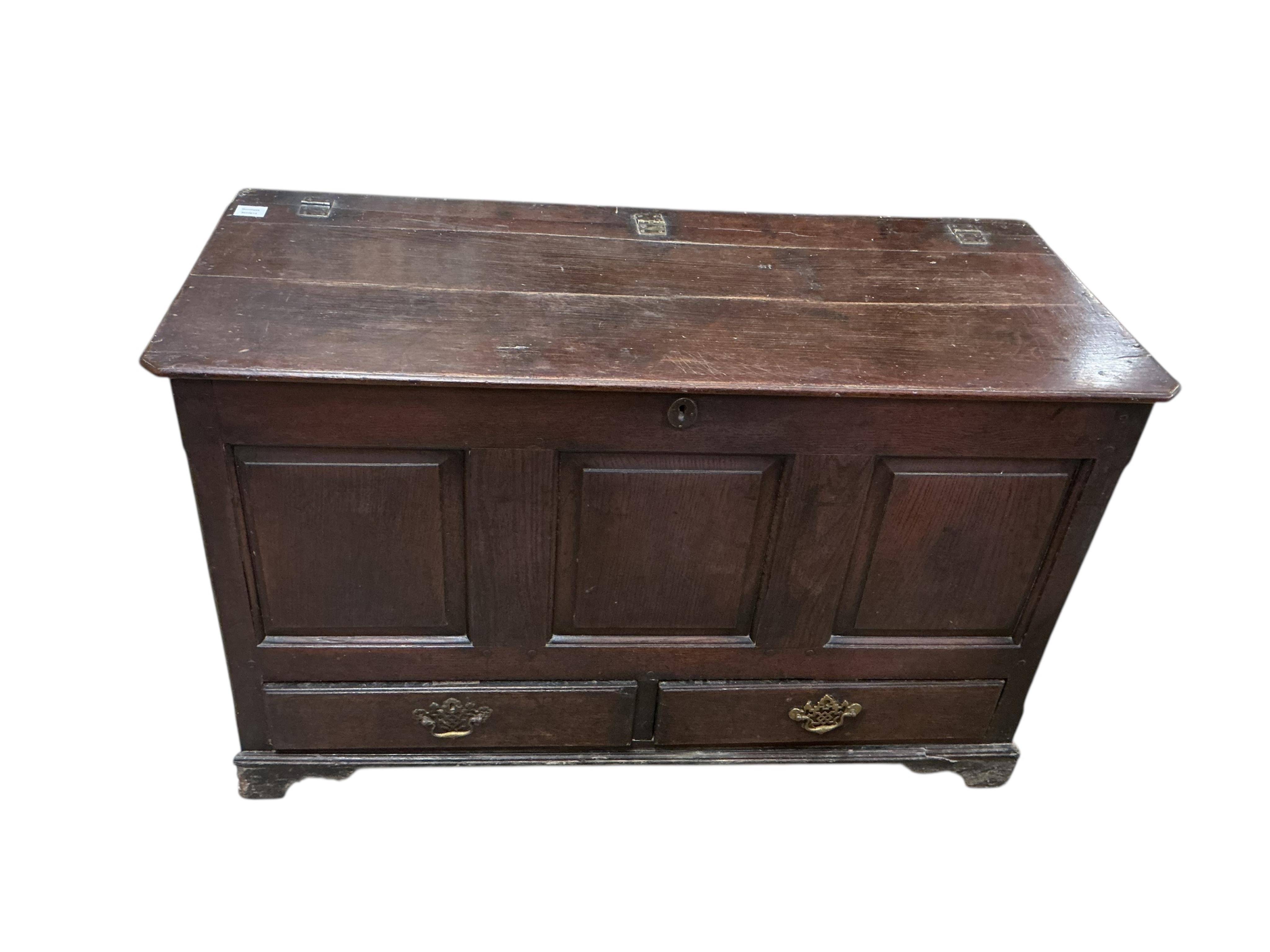 Lot 1089 , An 18th century panelled oak mule chest, width 121cm, depth 53cm, height 74cm