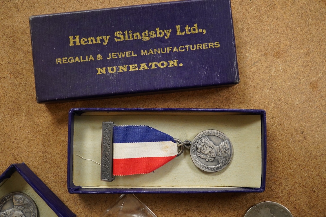 Lot 1485 , A small collection of silver coins and medals to include George III crown, 1820, Usa Morgan dollar, 1885, Edward VII florin, 1909, two George VI coronation medals in original boxes etc
