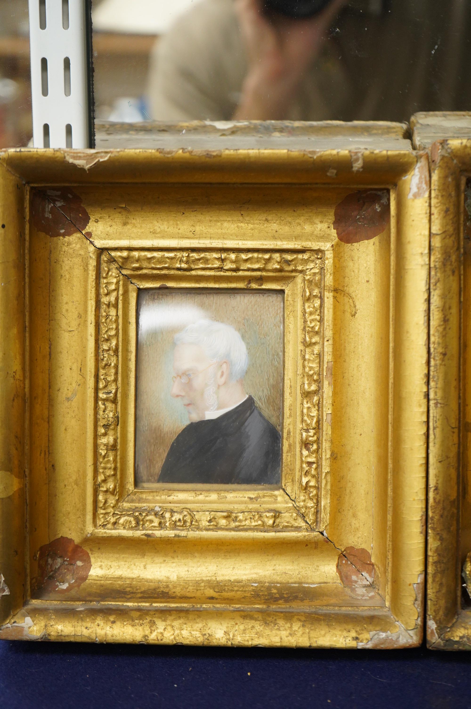 Late 19th / early 20th century school, portrait miniatures of George Crampton and his wife, each with pencil inscriptions verso, one indistinctly signed and dated, pair of oils on ivory, gilt framed, 9 x 7cm CITES Submission reference