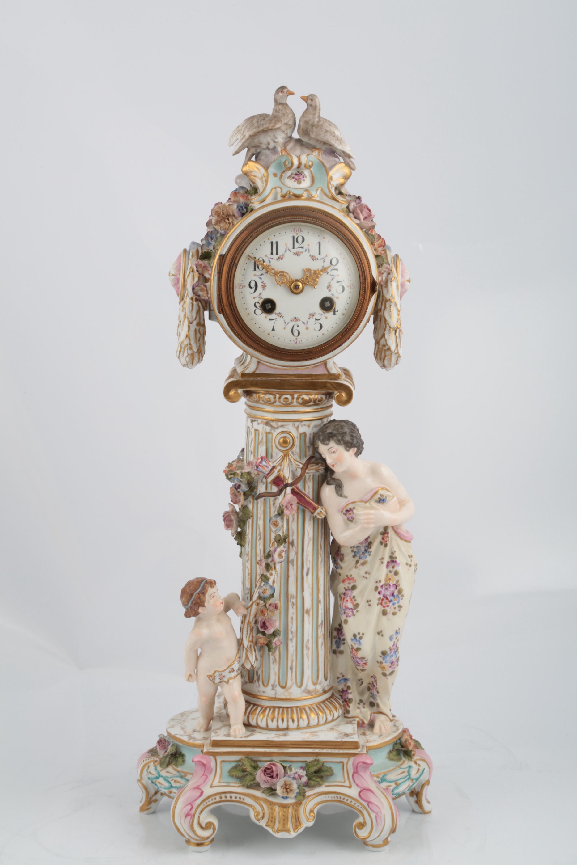 the case modelled as a column with the figures of Cupid and Psyche to each side surmounted by a drum shaped movement, the enamel dial with Arabic numerals, with twin dove surmount, pseudo crossed swords mark, 45.5cm high
