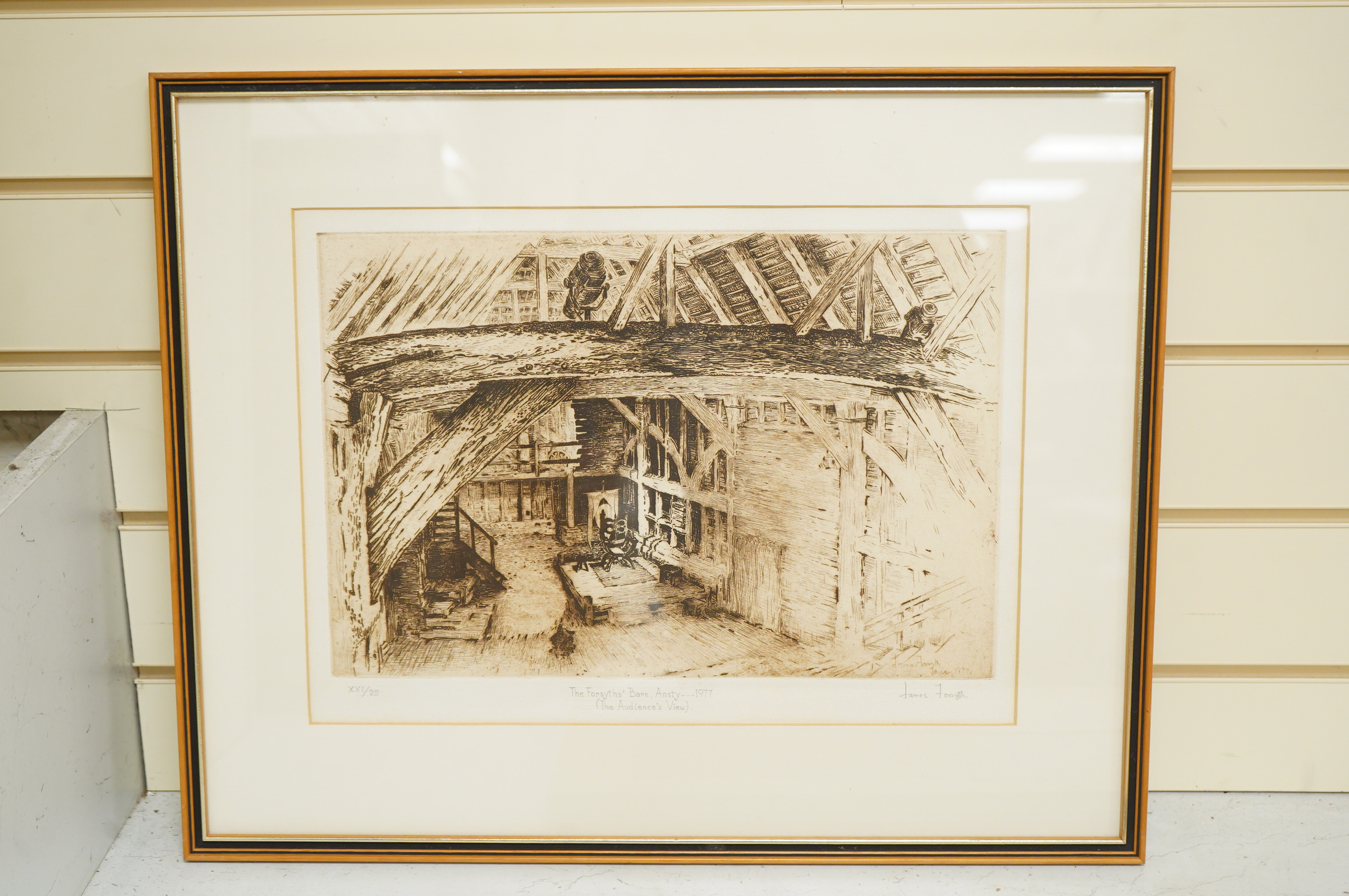 After James Forsyth (20th. C), ‘Porchester Castle’, colour print, together with ‘The Forsyths Barn, Ansty, 1977’, an etching numbered XXI/25, signed in pencil, largest 29 x 39cm