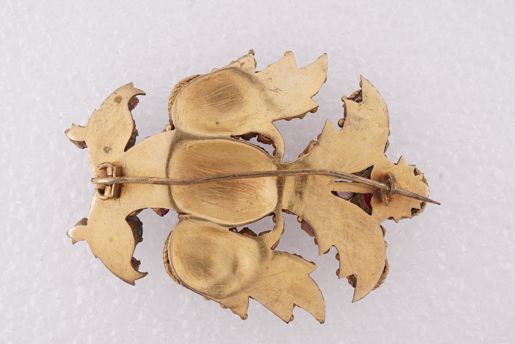 A gem-set brooch, set with variously cut stones including two sapphires, garnets, green serpentine, garnets, amethysts, rock crystals and zircons, mounted in gilt metal, length approximately 5.8cm