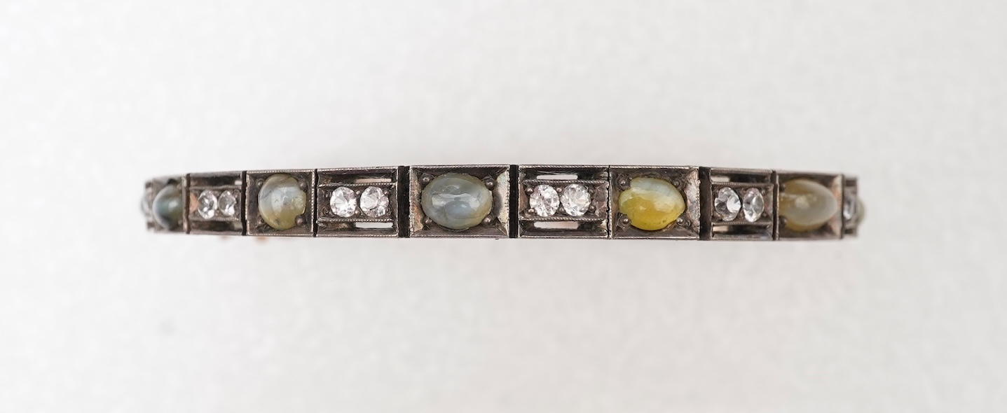 A cat's eye chrysoberyl and white sapphire bracelet, composed of rectangular links set with cabochon cat's eye chrysoberyls, spaced by pairs of colourless simulant diamonds, mounted in silver, length 18.5cm