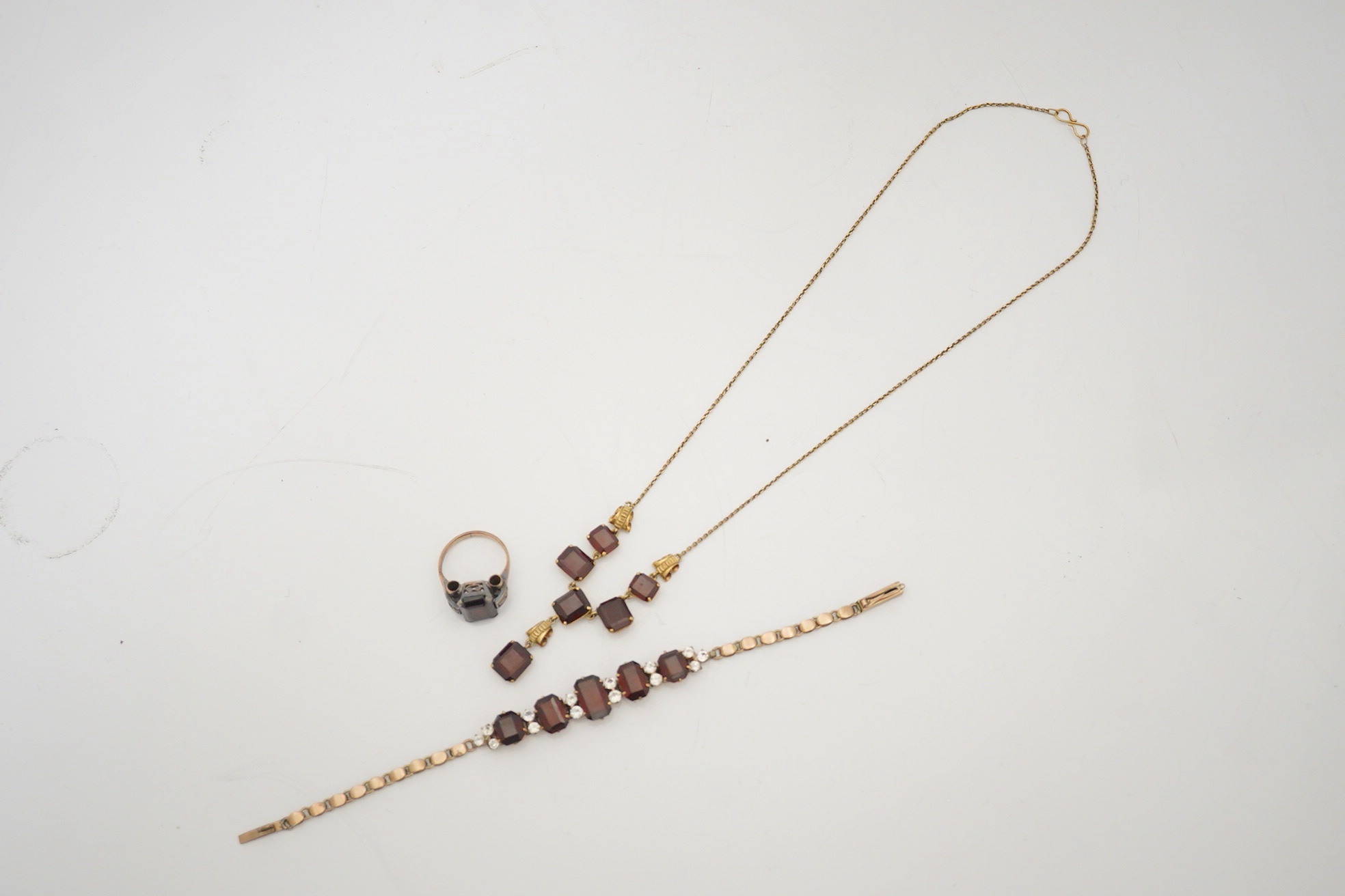 A suite of garnet jewels, comprising: a necklace set to the front with step-cut garnets, mounted in gold, length 40cm; a garnet and quartz bracelet mounted in gold, length 16cm; and a ring set with a step-cut garnet and simulant diamonds, mounted in gold, size H1/2, gross weight approximately 21 grams