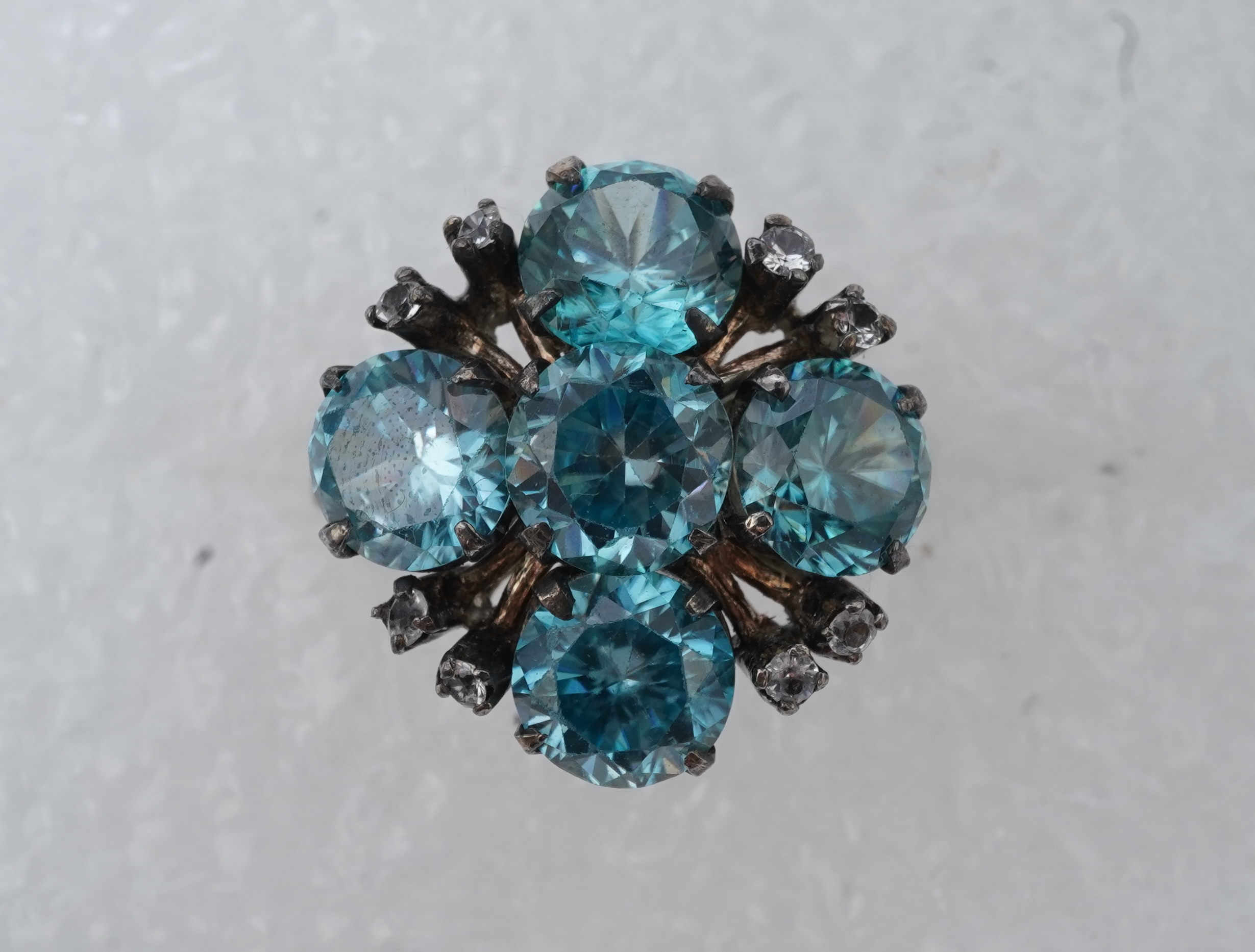 A blue zircon cocktail ring, mid 20th century, of cluster design, set with five brilliant-cut blue zircons and circular diamond simulants, mounted in gold, size K1/2, gross weight approximately 4.9 grams