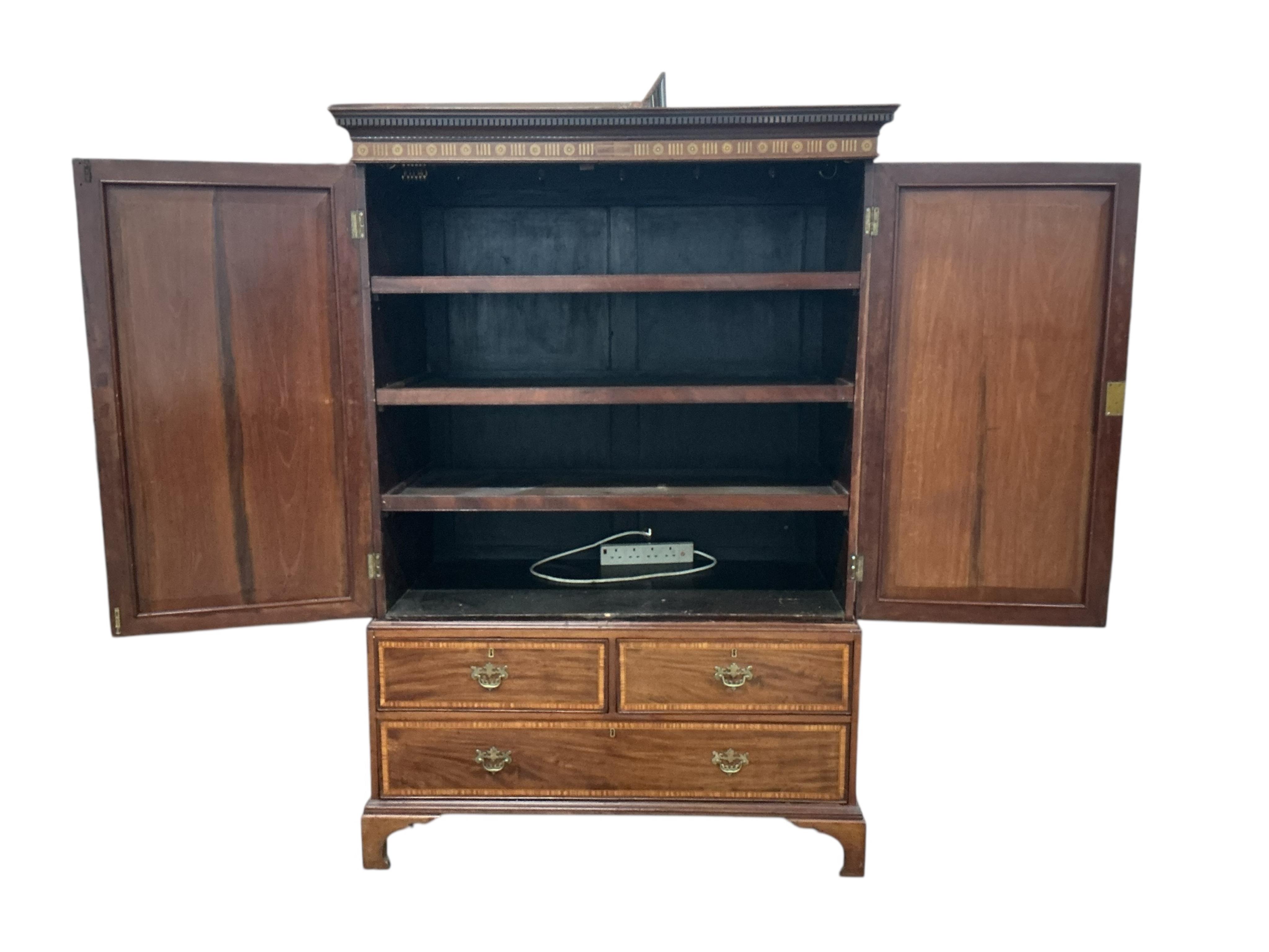 Lot 83 , A George III satinwood banded and inlaid mahogany linen press, width 127cm, depth 64cm, height 185cm
