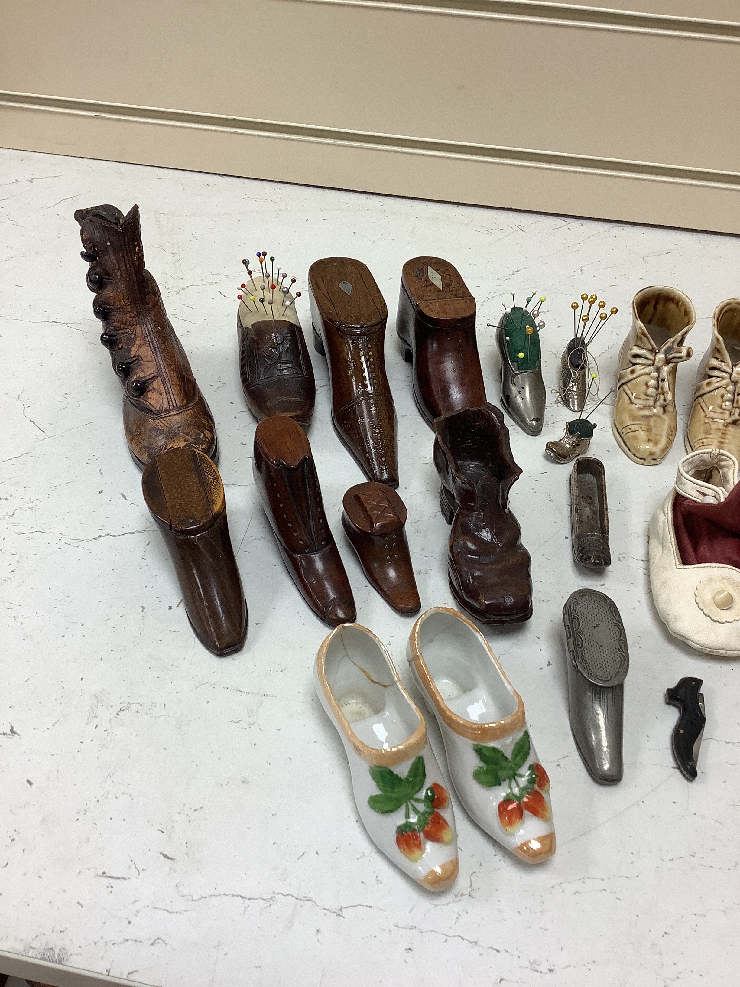 Four 19th century carved mahogany boot snuff boxes, largest 15cm, and other miscellaneous boot and shoe ornaments