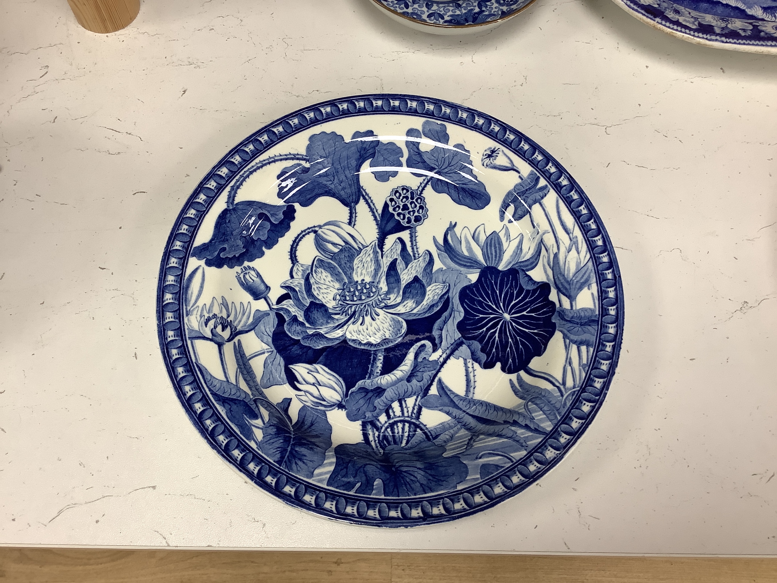 Lot 1164 , Three Wedgwood blue and white water lily plates, a Briarrose border meat dish, a chestnut basket, a pole wear two handled cup and a tea bowl and saucer, largest 33cm wide (7)
