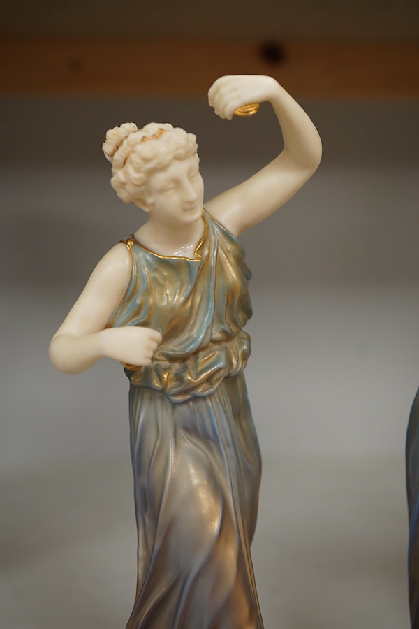 A pair of Royal Worcester blush ivory female dancers, date-code 1926, and similar youth tuning his violin, 21cm.