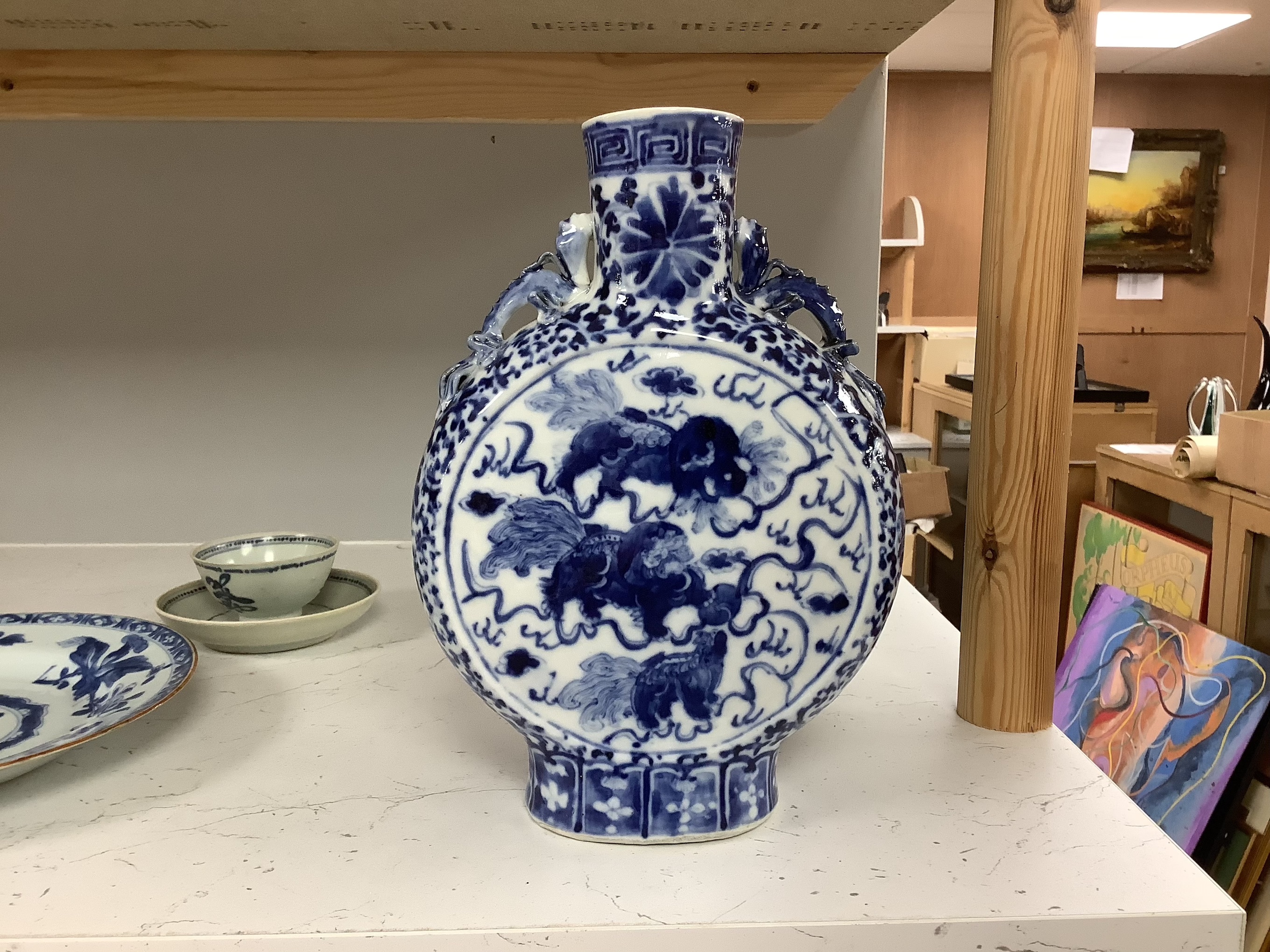 Lot 1146 , Chinese blue and white porcelain consisting of a moonflask, 18th century plate, a Tek Sing cargo tea bowl and saucer and a doucai saucer, largest 25cm high