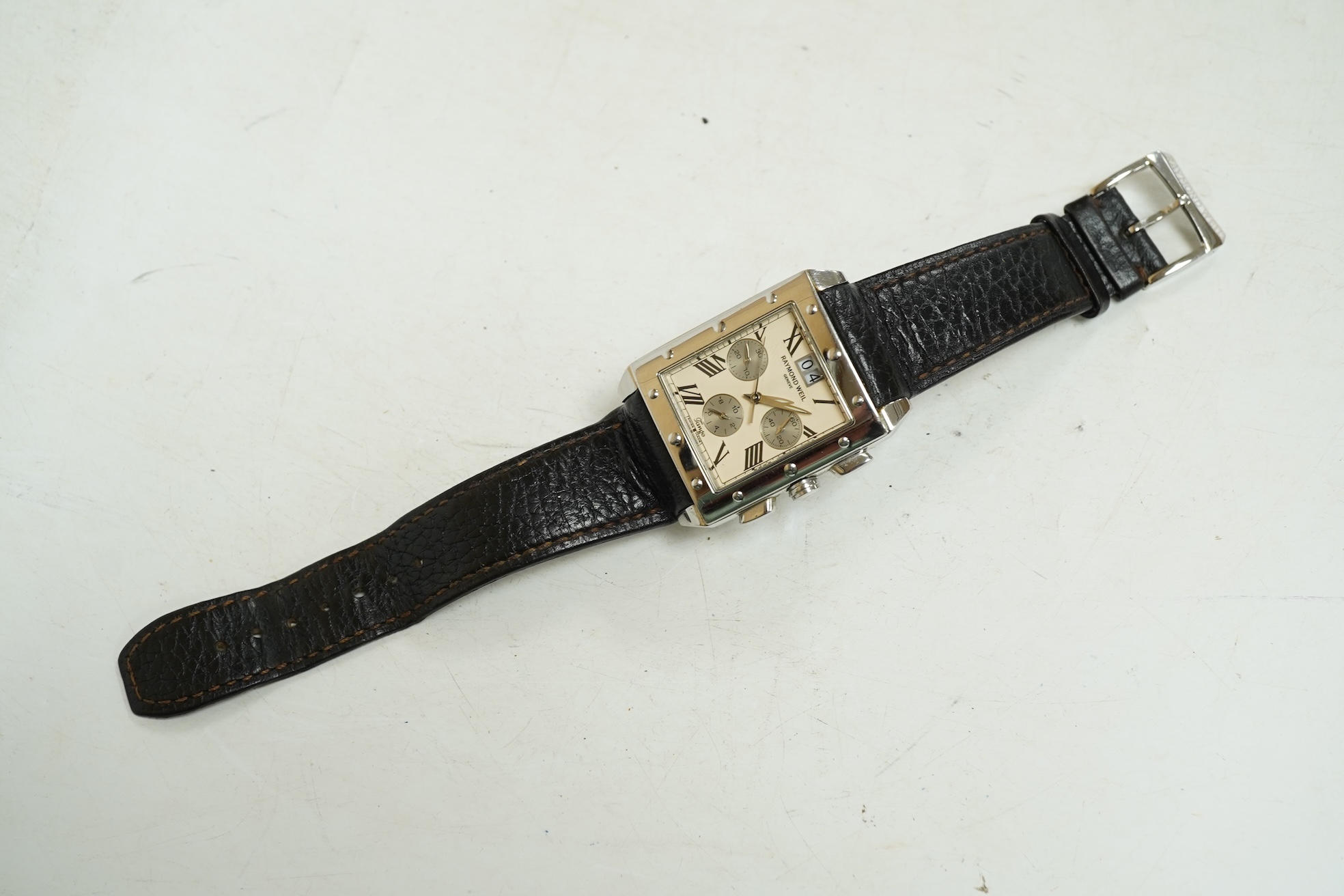 Lot 1916 , A gentleman's recent stainless steel Raymond Weil Tango collection tank wrist watch, with Roman dial, date aperture and three subsidiary dials, ref 4881, case diameter 33mm, on a leather strap with Raymond Weil buckle, w