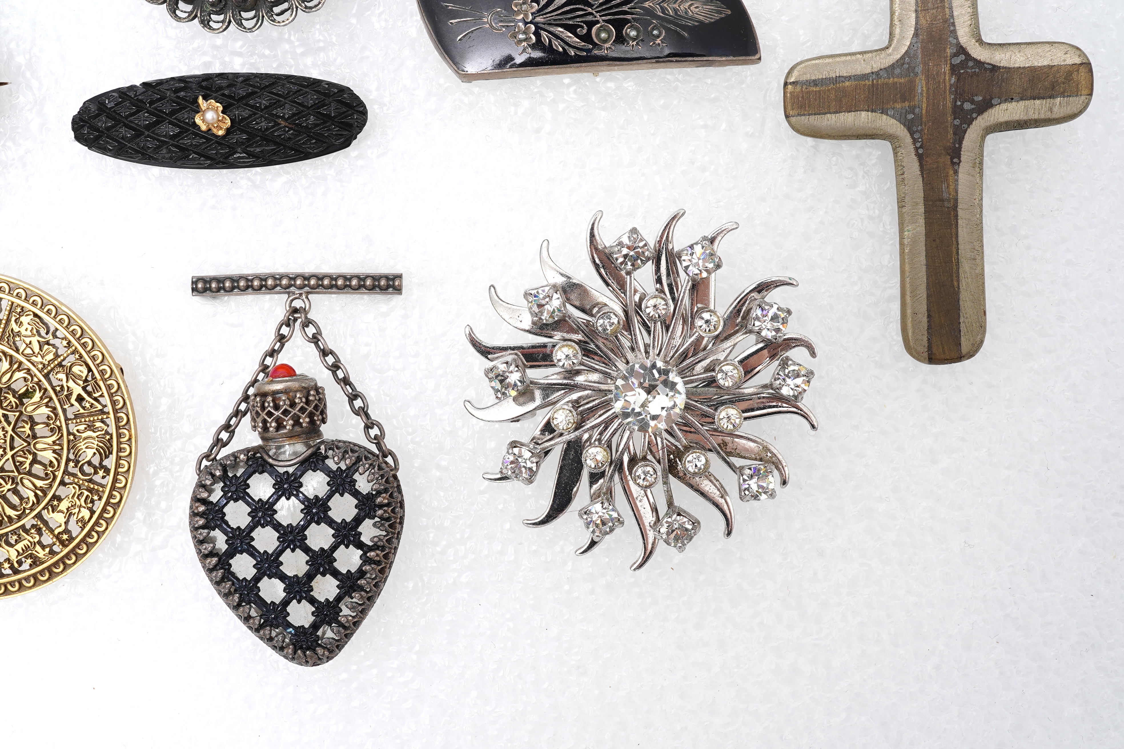 A collection of jewels, comprising: a metal collar necklace suspending a cross pendant; a black glass bead necklace; an amethyst, iolite, moonstone and mother of pearl pendant; a gilt metal pendant containing hairwork; a paste sunburst brooch; a banded onyx brooch; a gilt metal zodiac wheel brooch; a black enamel and seed pearl panel brooch; a drilled Spanish silver coin pendant dated 1738 on a silver chain; a pair of marcasite earrings; a heart-shaped scent bottle fob brooch; a filgree brooch with an Arabic inscription; and a black resin/moulded bog oak brooch centring on a gold and seed pearl trefoil motif