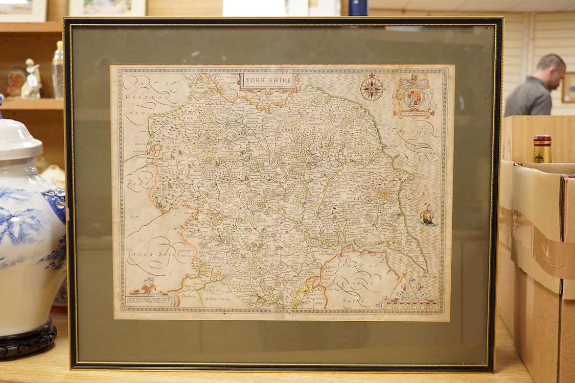 After John Speed (1552-1629), hand coloured engraved map of Yorkshire, sold by Thomas Bassett and Richard Chiswell, 39 x 52cm
