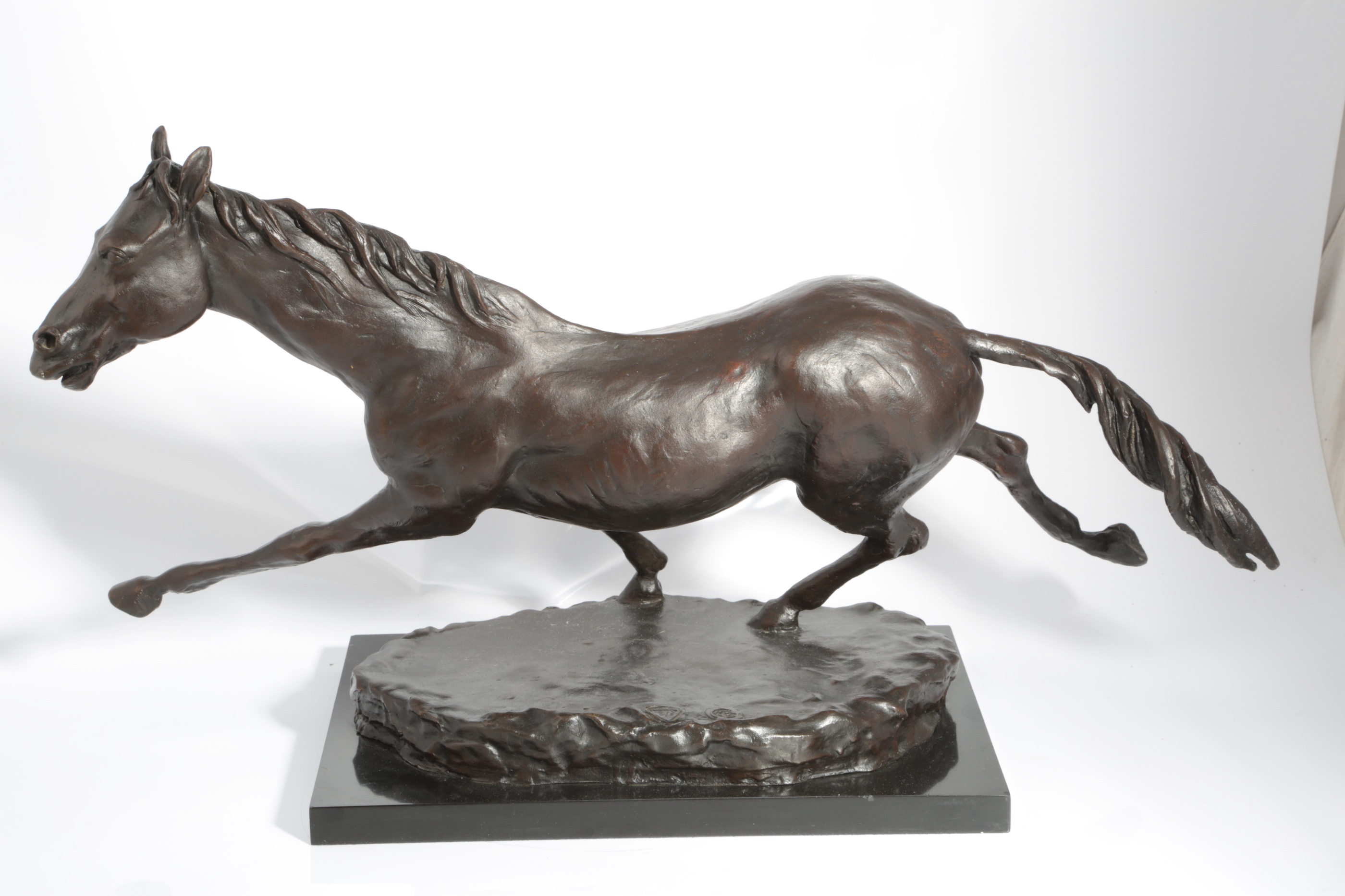 § Enzo Plazzotta (1921-1981). A bronze galloping horse, cast foundry mark and edition number 6/9, on a black slate rectangular, 39cm high, 67cm long